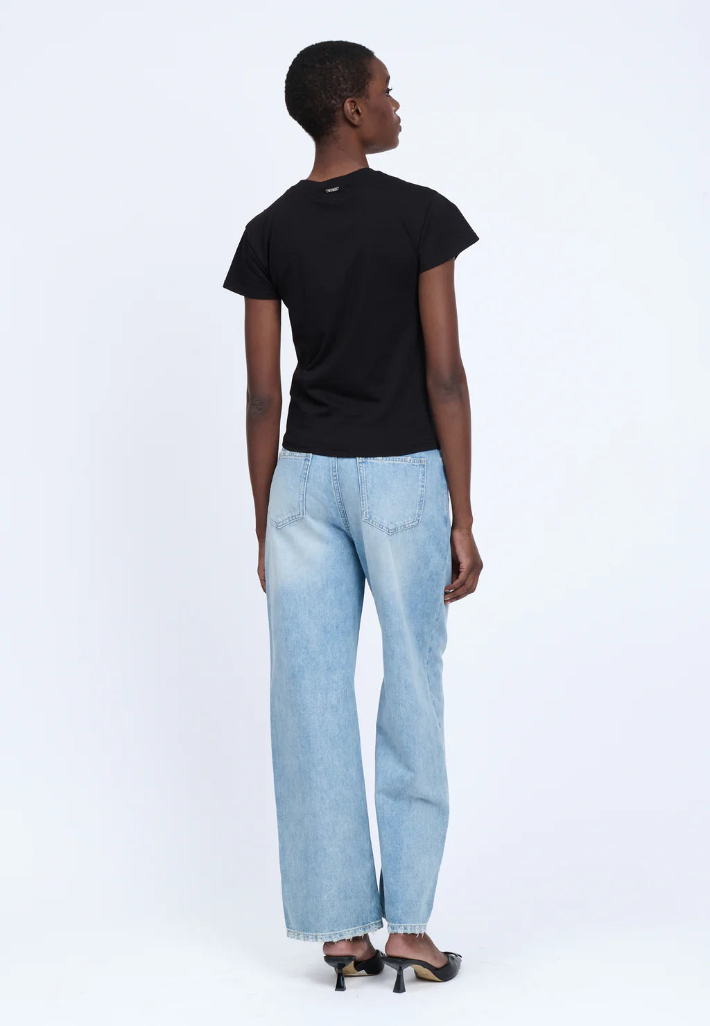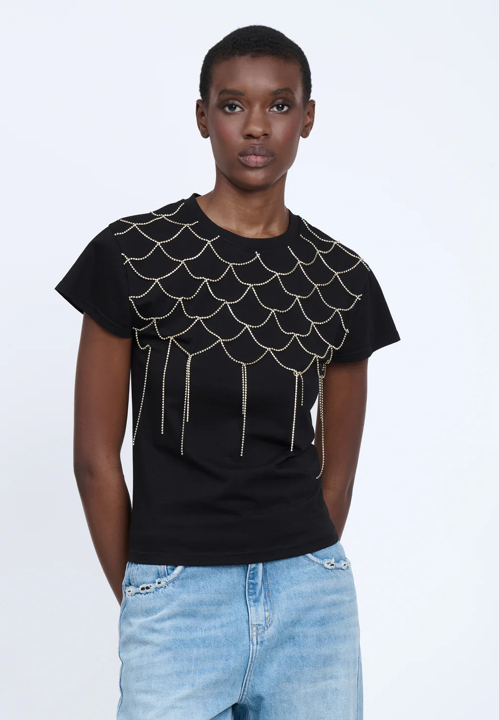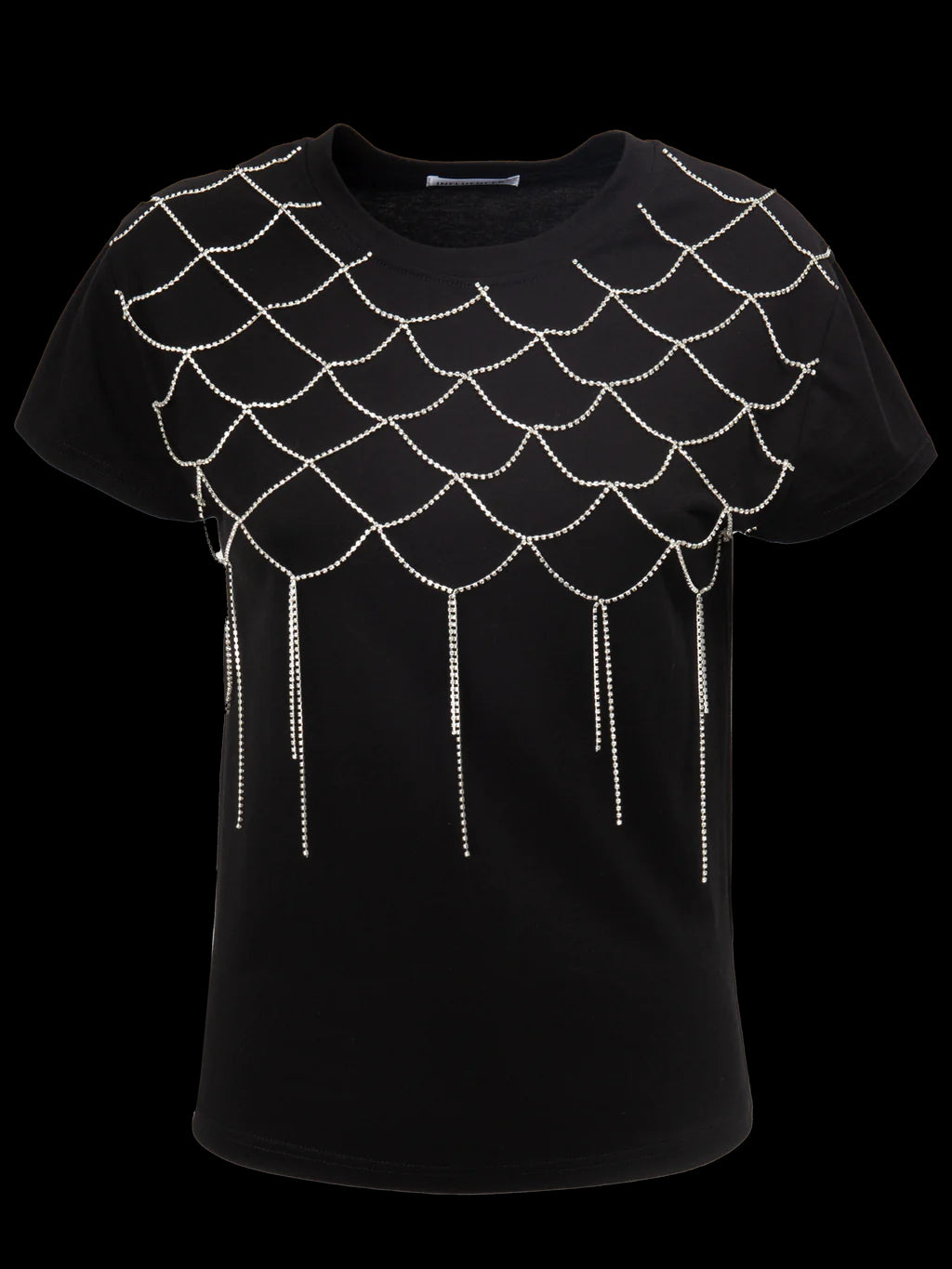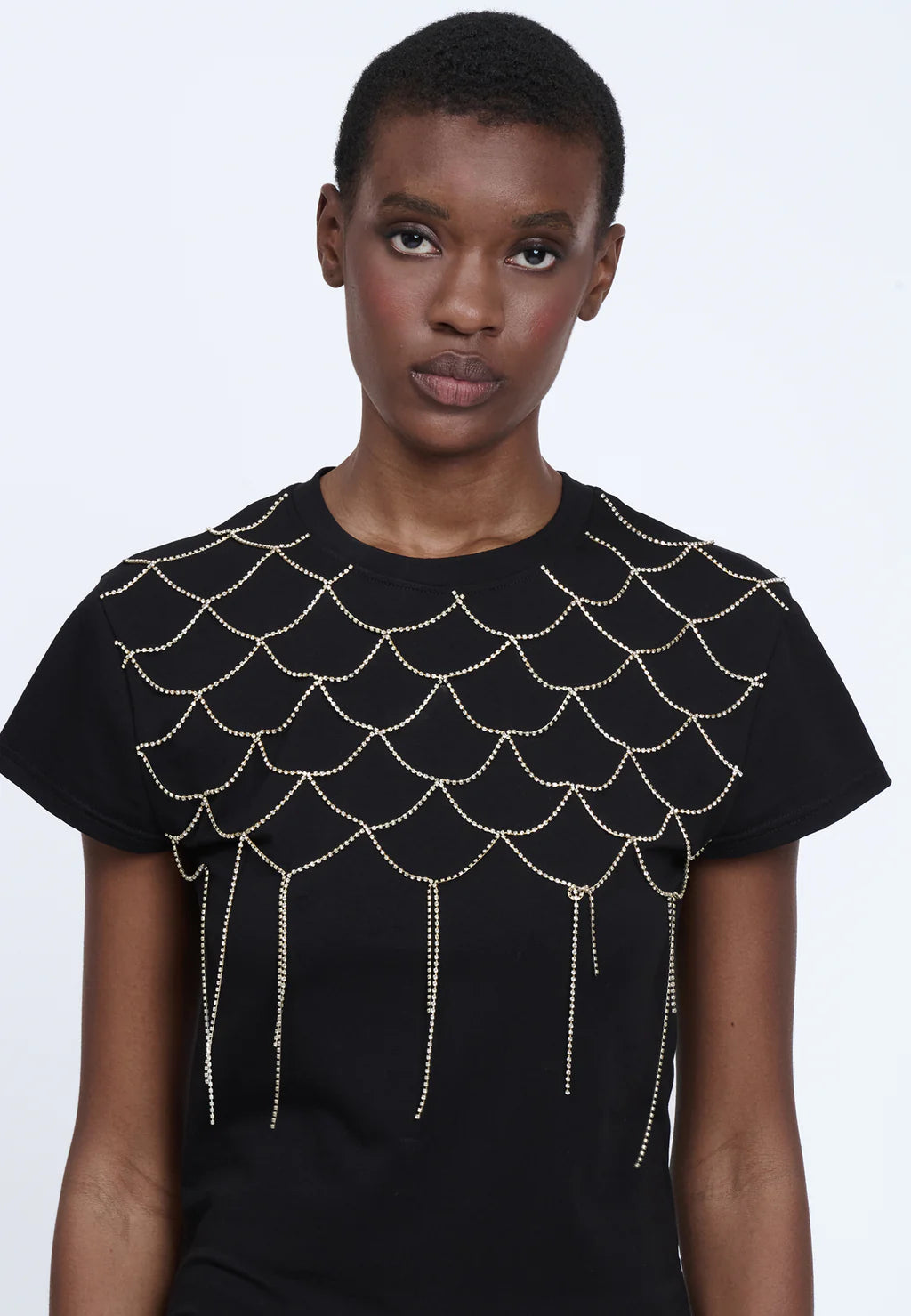 Questa t-shirt a girocollo e maniche corte, in jersey di cotone, si presenta con un taglio aderente e dall'applicazione di strass con motivo geometrico che finisce con catenelle a cascata. Di notevole impatto, è un'aggiunta dal tocco luxury al tuo outfit quotidiano.