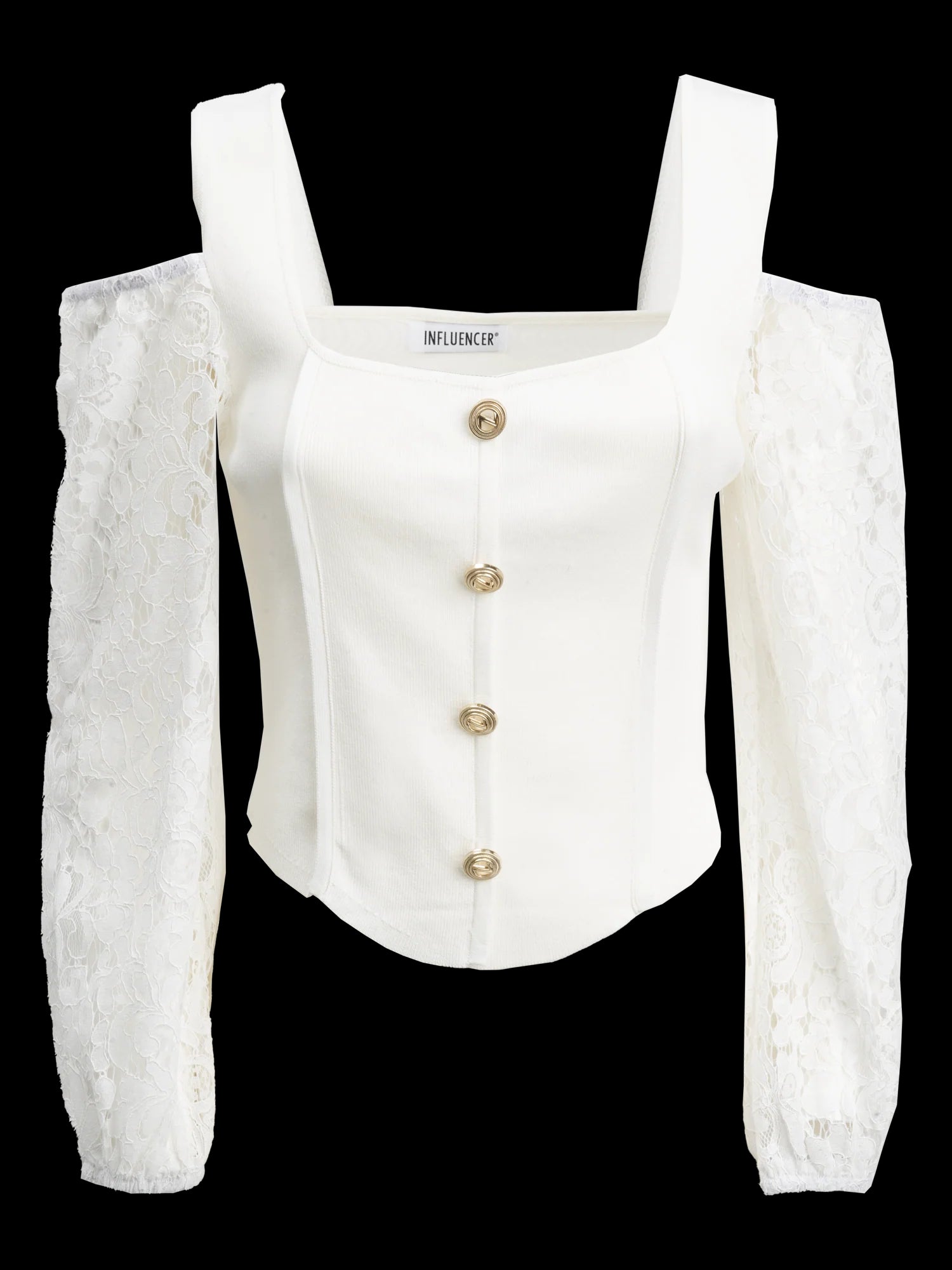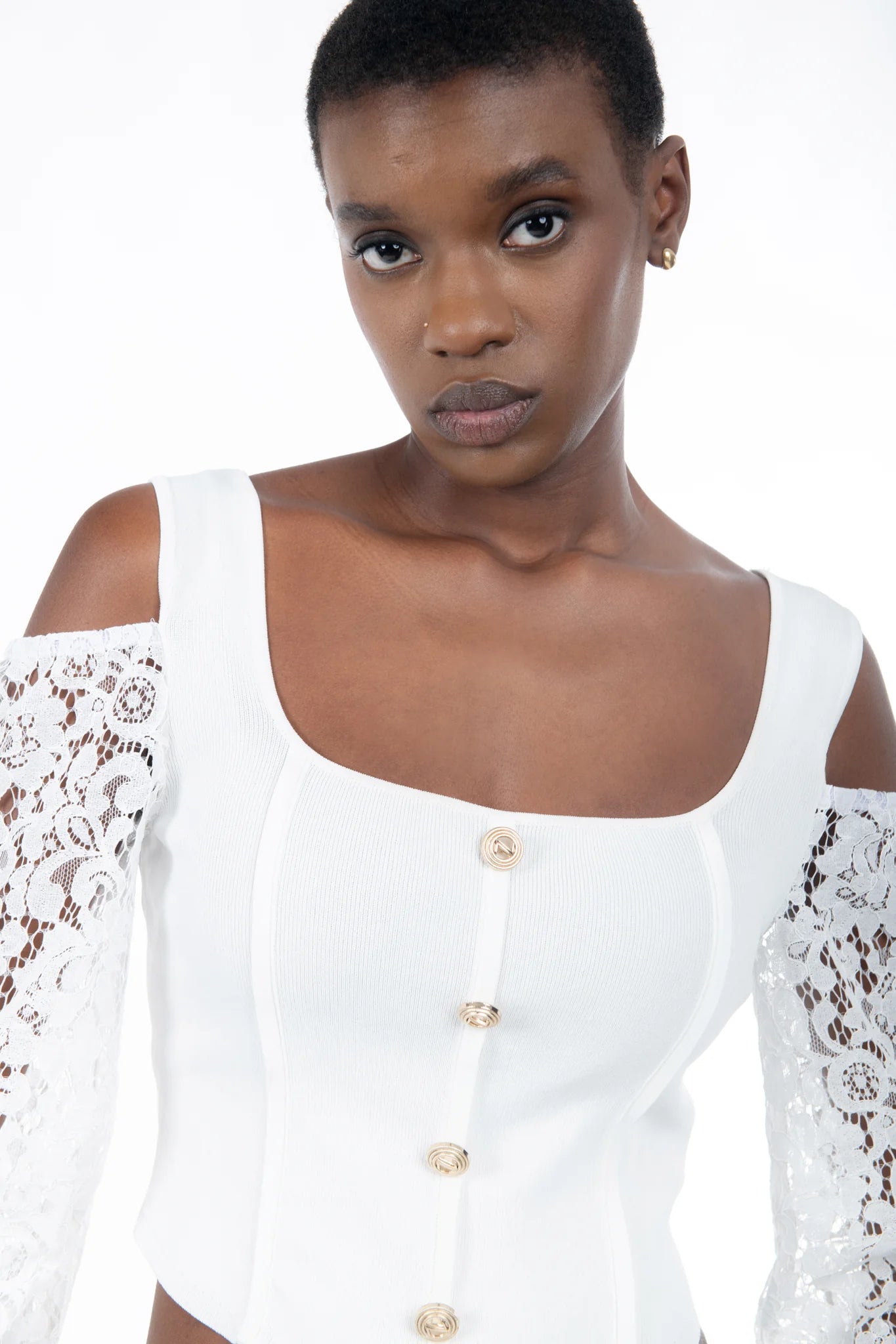 Esalta il tuo look con questo top in maglia a punto trattenuto che richiama il design del bustier. Dotato di una finta chiusura con bottoni dorati maniche in pizzo in tinta, si abbina facilmente a jeans, cintura e sandali con strass per strutturare la silhouette