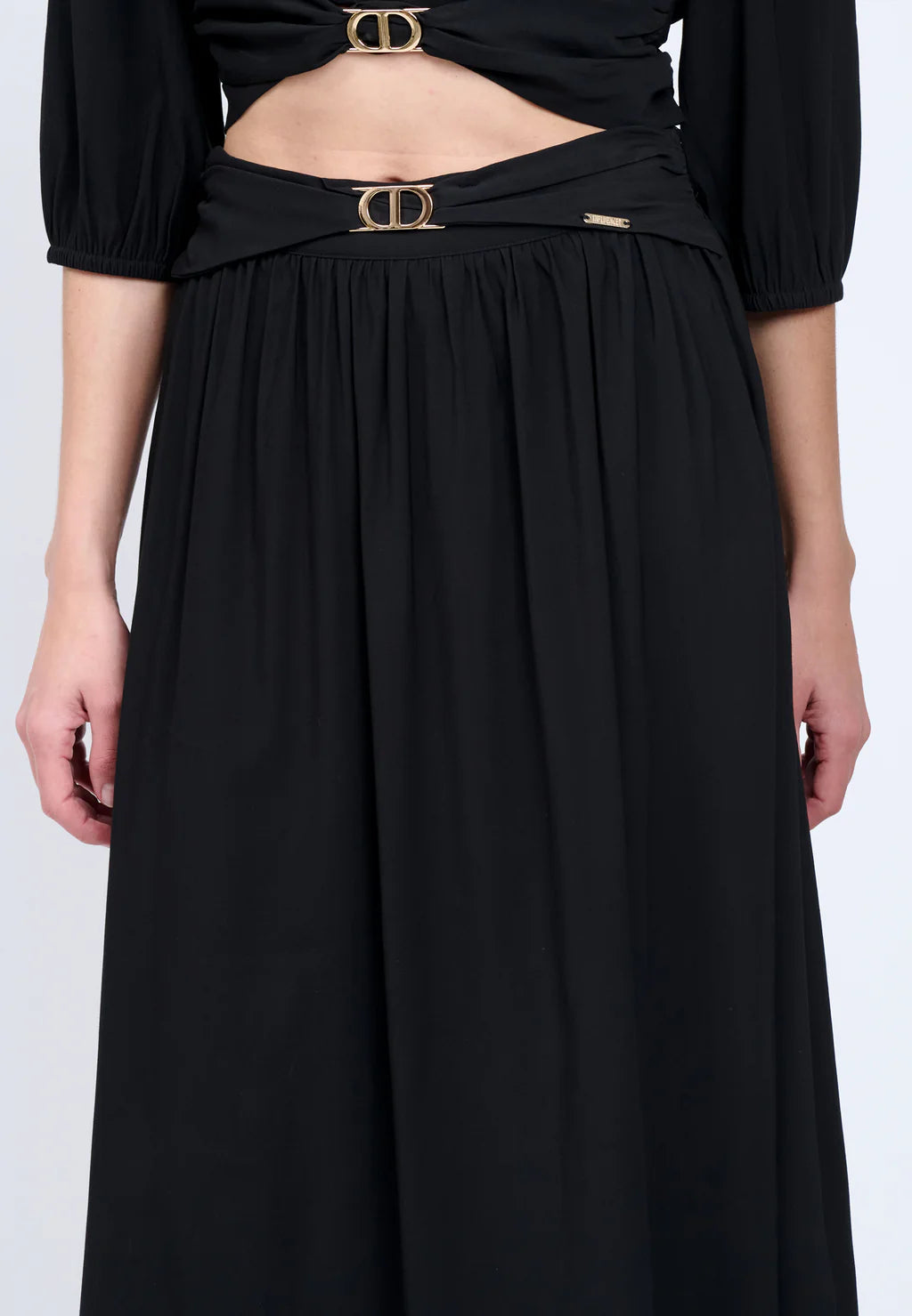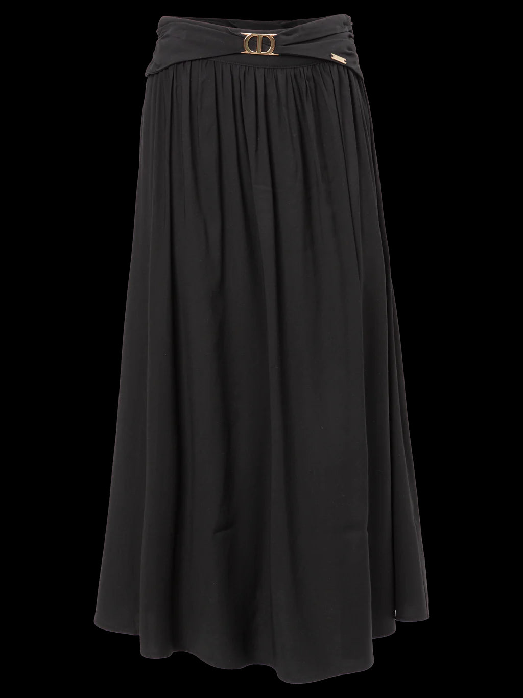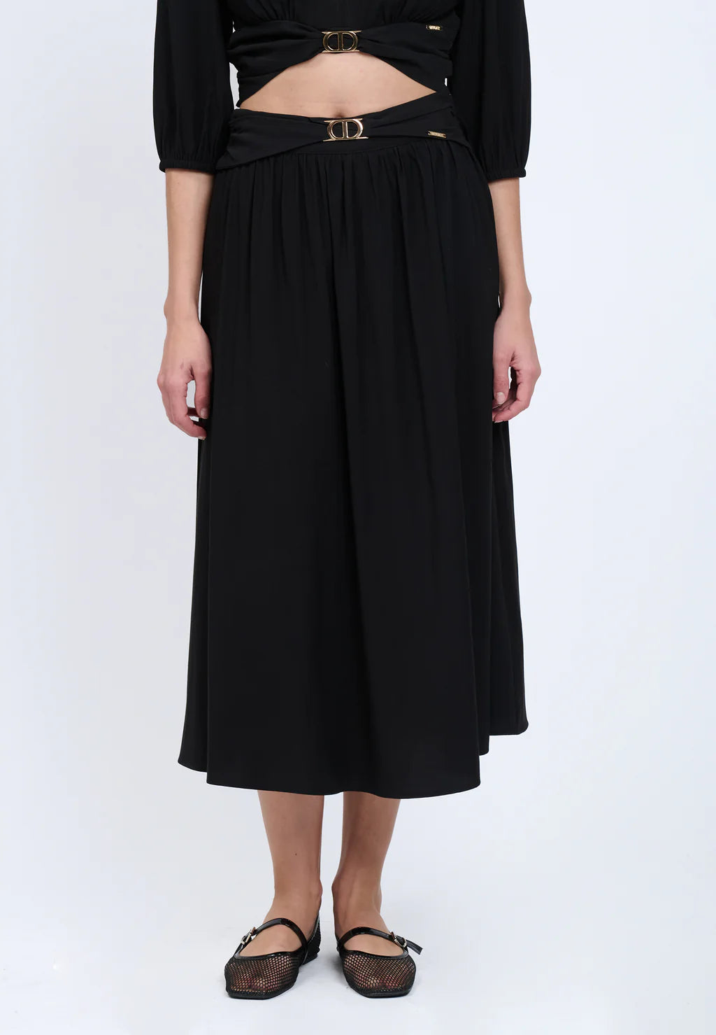 gonna realizzata in un fresco tessuto di viscosa ha una vestibilità plissettata e molto svasata, che slancia il fisico. La sottile cintura con fibbia decorativa evidenzia il punto vita.