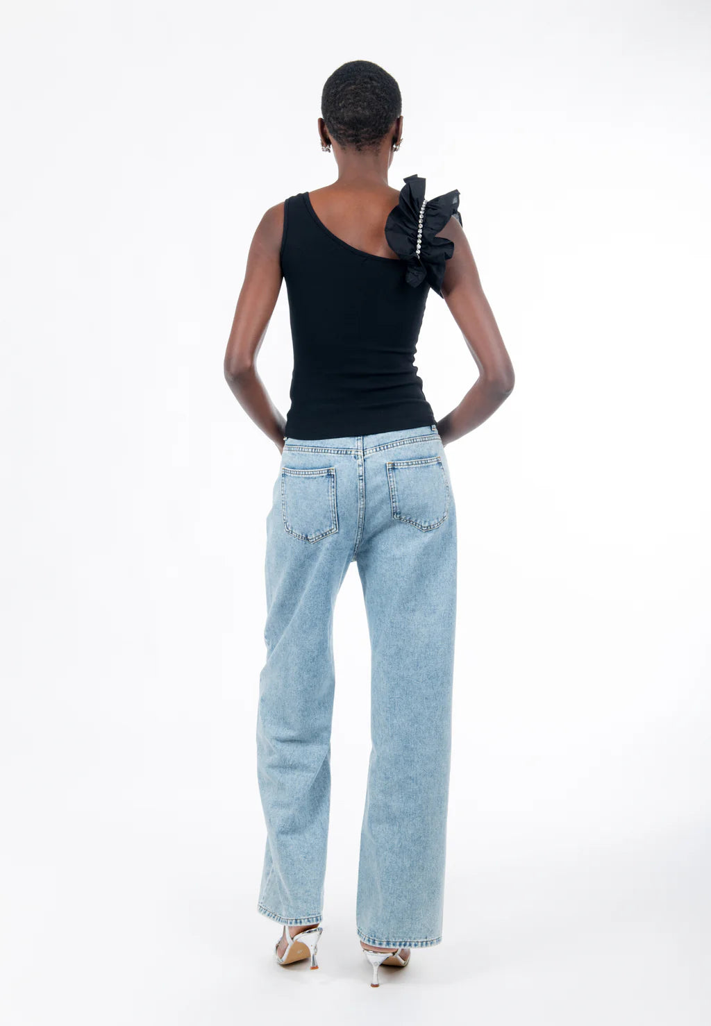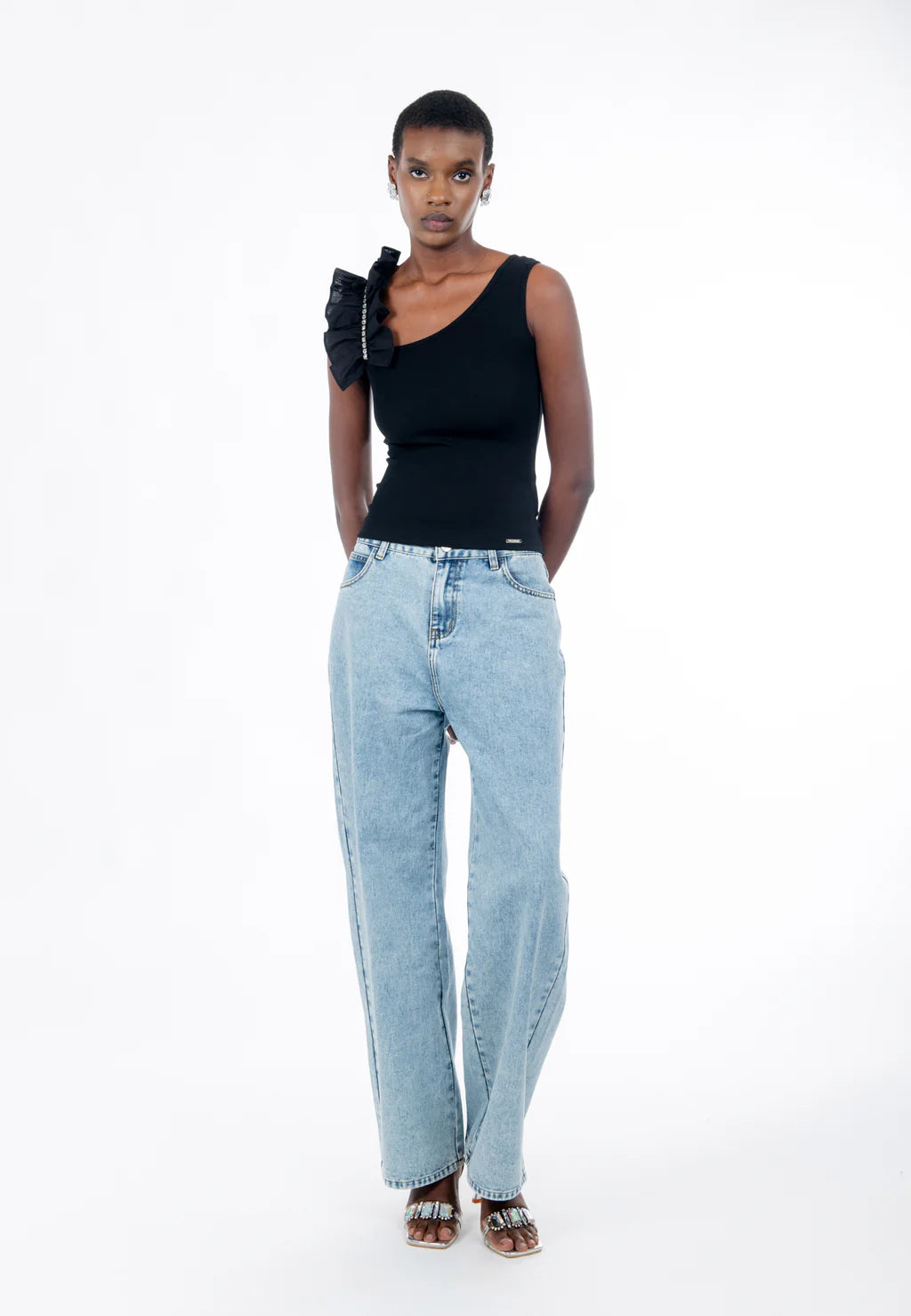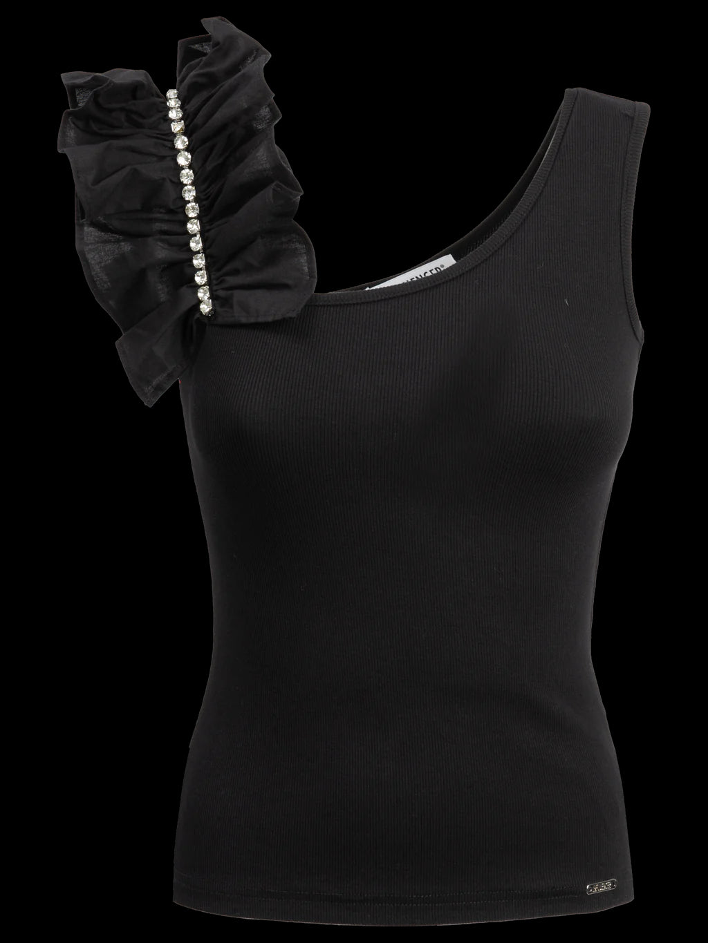 CANOTTA con lavorazione a costine, ha un giromanica con rouches in tinta delineata con un profilo di strass silver al centro. È casual e ricercata: crea un contrasto stilistico abbinandola a dei jeans baggy-fit e sandali o a uno short per un look urban-chicDa indossare con dei pantaloni e delle décolleté per un look slanciato ed elegante