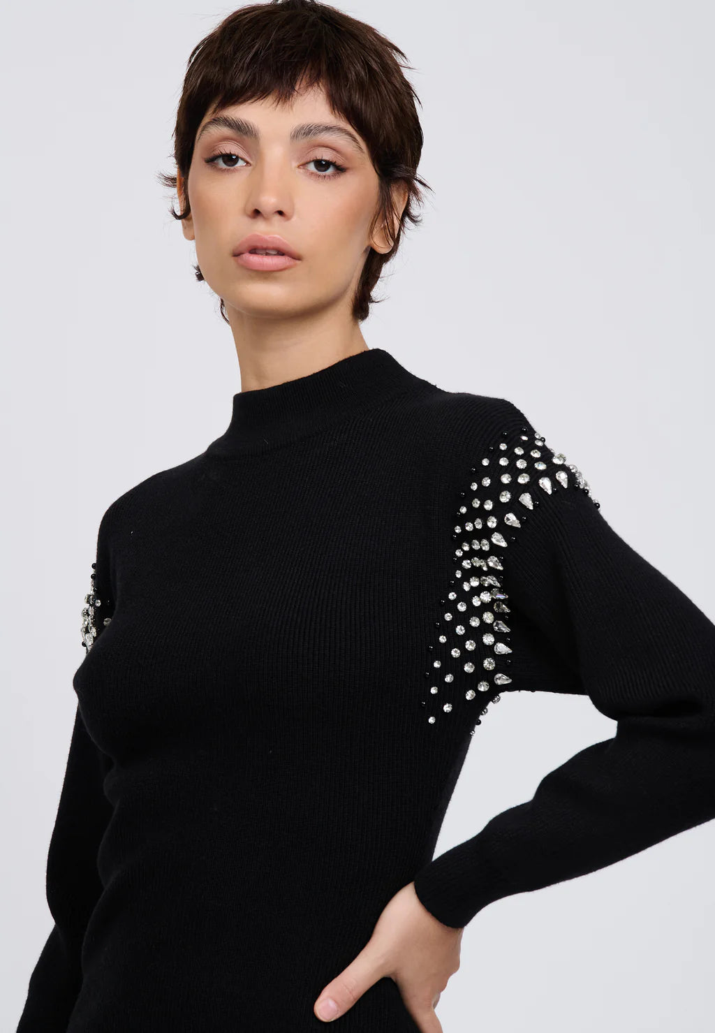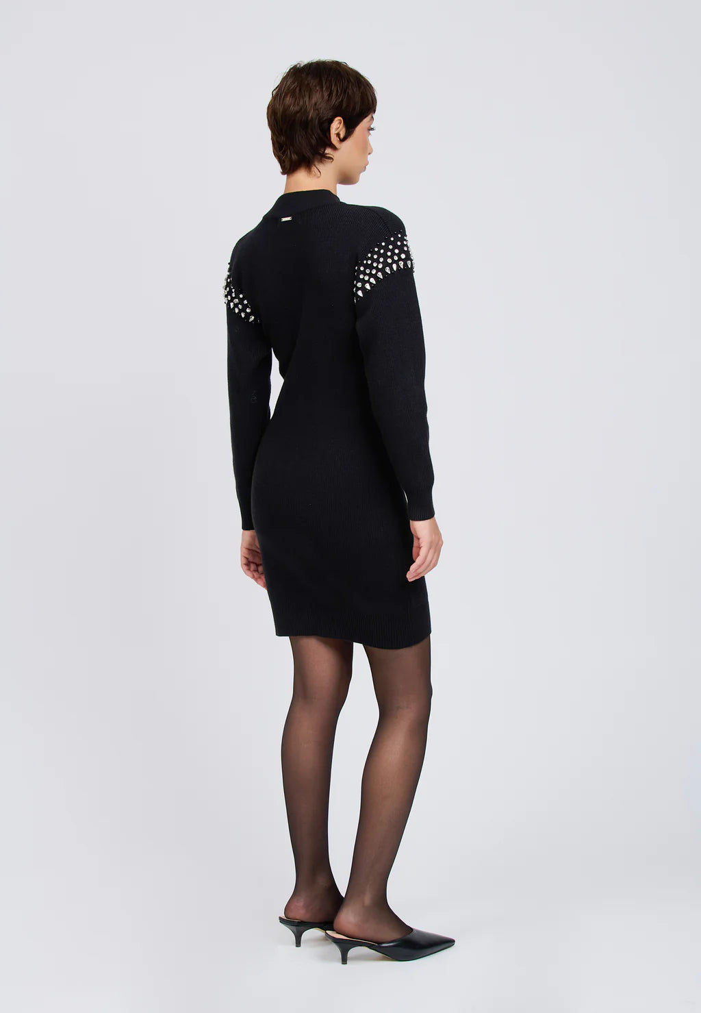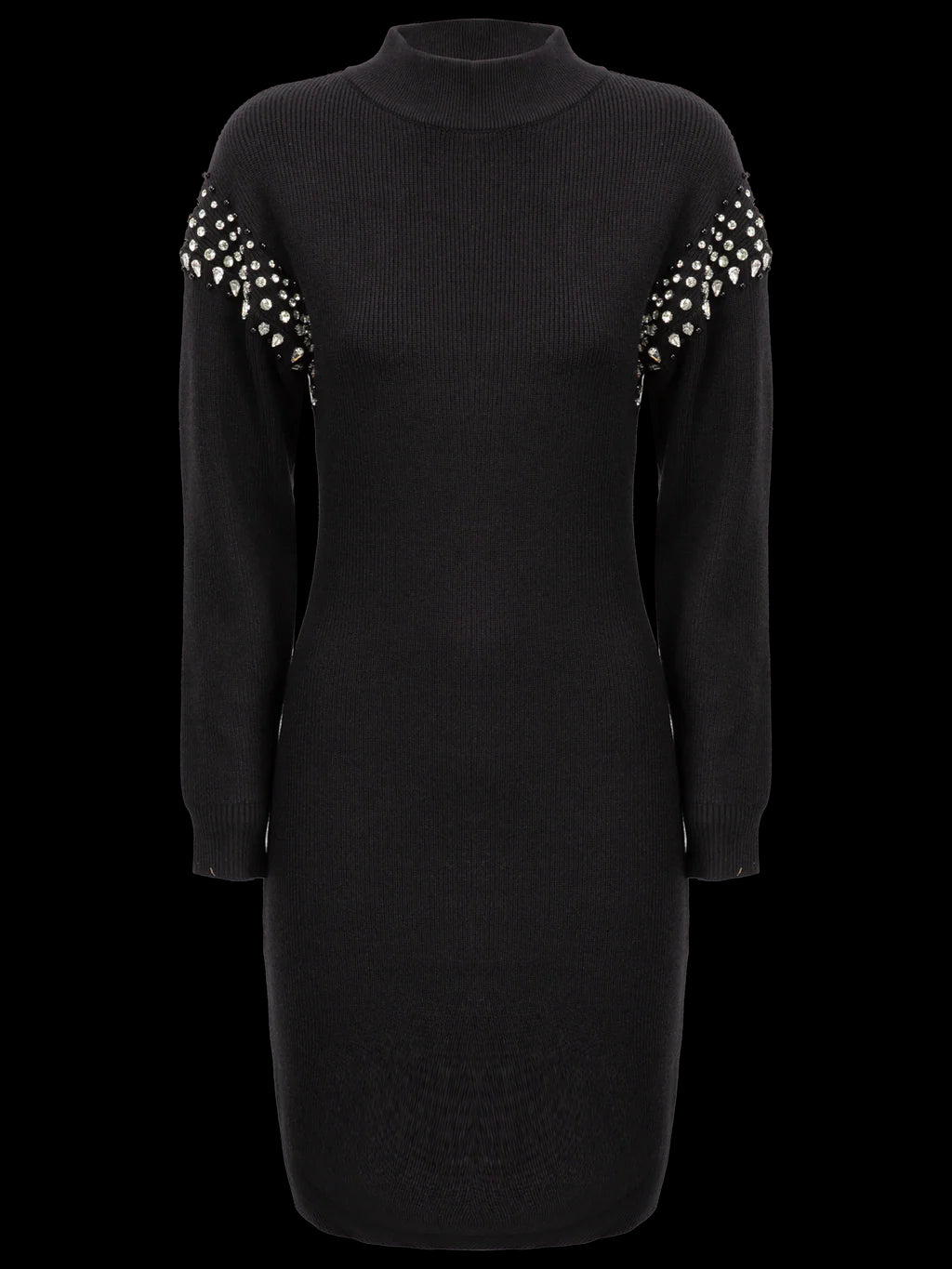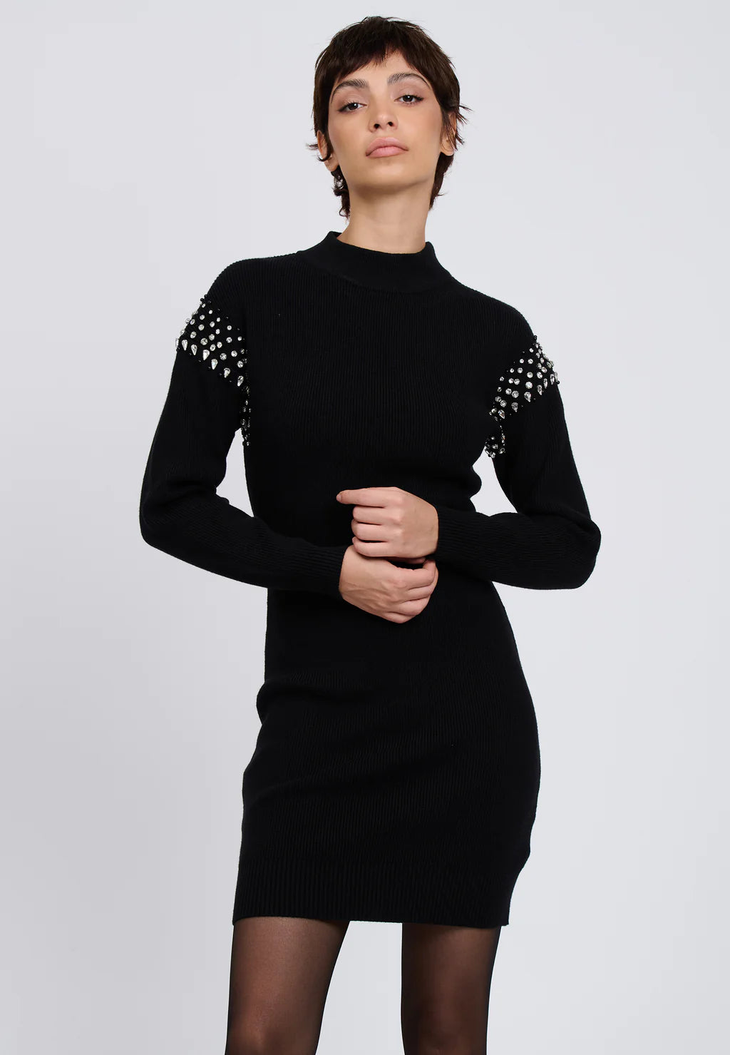 Realizzato in maglia a coste sottili, questo abito corto e aderente rivela un collo alto e spalle scese che valorizzano la figura. Impreziosito dalle applicazioni luxury sul giromanica, è rifinito con orli a costine per una maggiore aderenza e comodità.