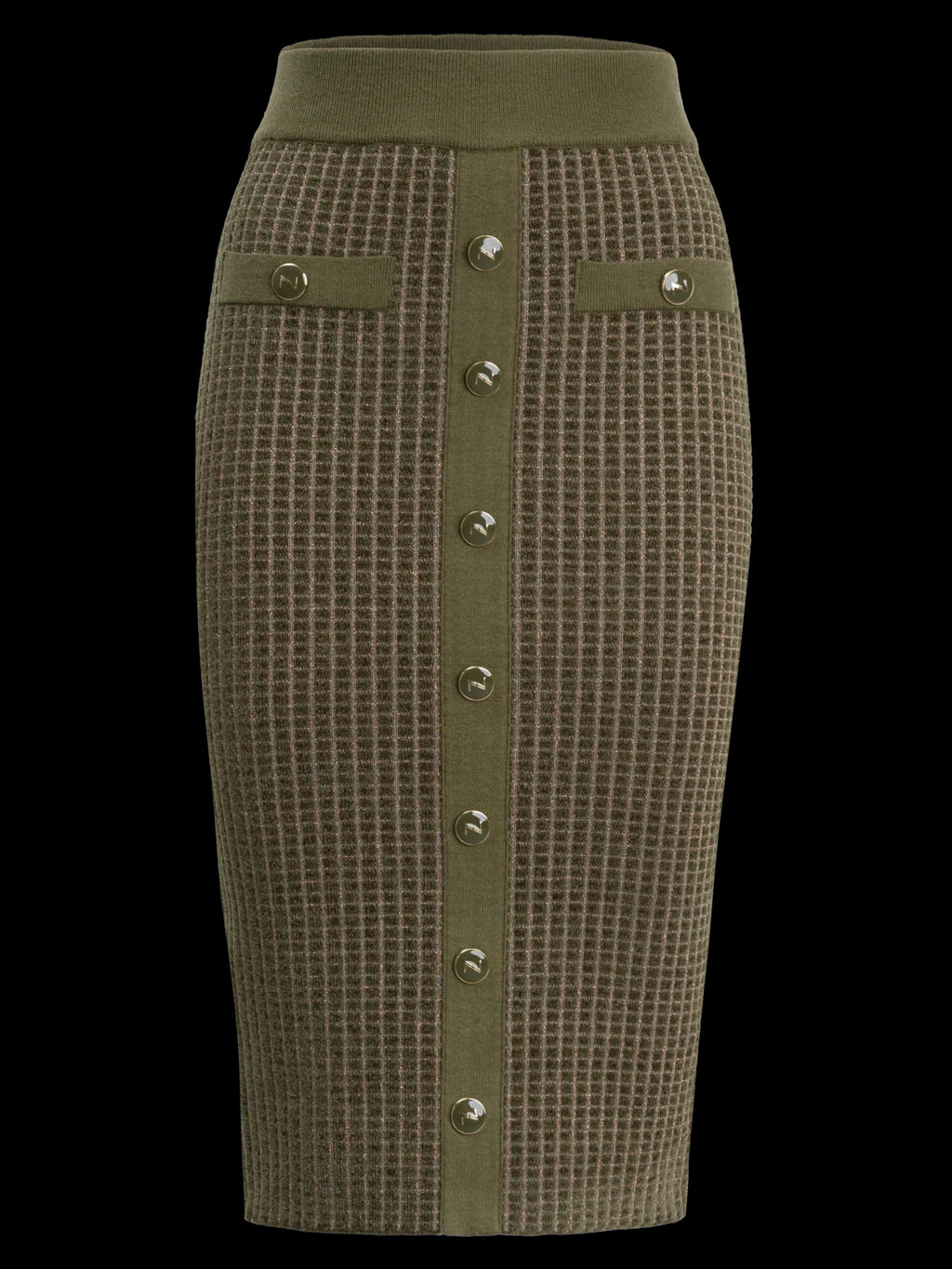 Questa gonna longuette in maglia aggiunge un tocco di sofisticata disinvoltura alla silhouette. Le sue tasche a filetto e i bottoni logo decorativi ne sottolineano la struttura, mentre la morbida aderenza e la vita elasticizzata garantiscono grande comfort. Si indossa con il cardigan e top in coordinato, o con una camicia in chiffon dal gusto retrò per ottenere un look chich e raffinato dal richiamo vintage.