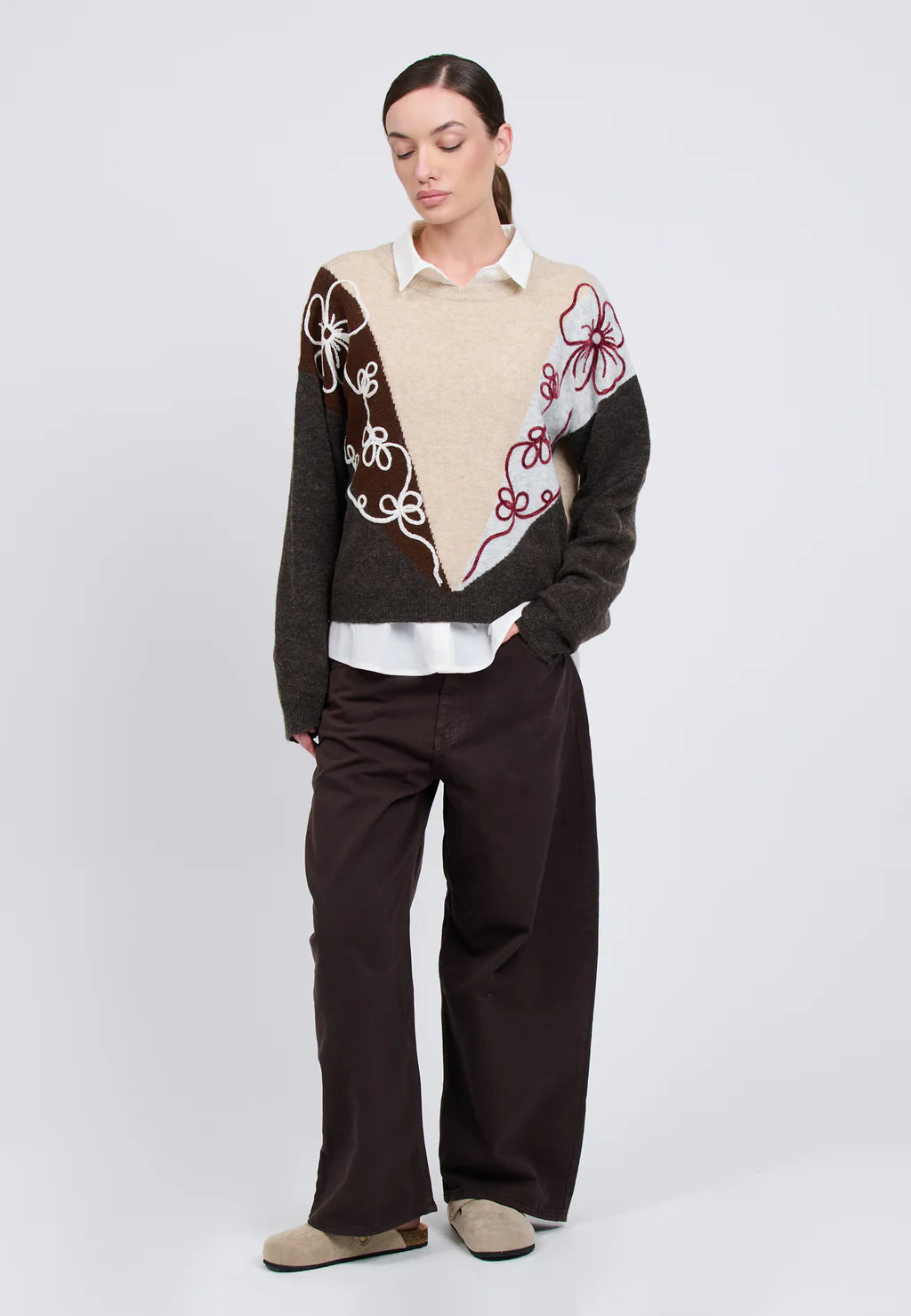 Una maglia che richiama lo stile patchwork handmade dal gusto retrò. Si presenta a blocchi di colore e con un ricamo floreale a contrasto che aggiunge un tocco romantico all'insieme. La vestibilità over la rende confortevole e perfetta da essere indossata sovrapposta ad una camicia e su un pantalone carpenter e mocassini.