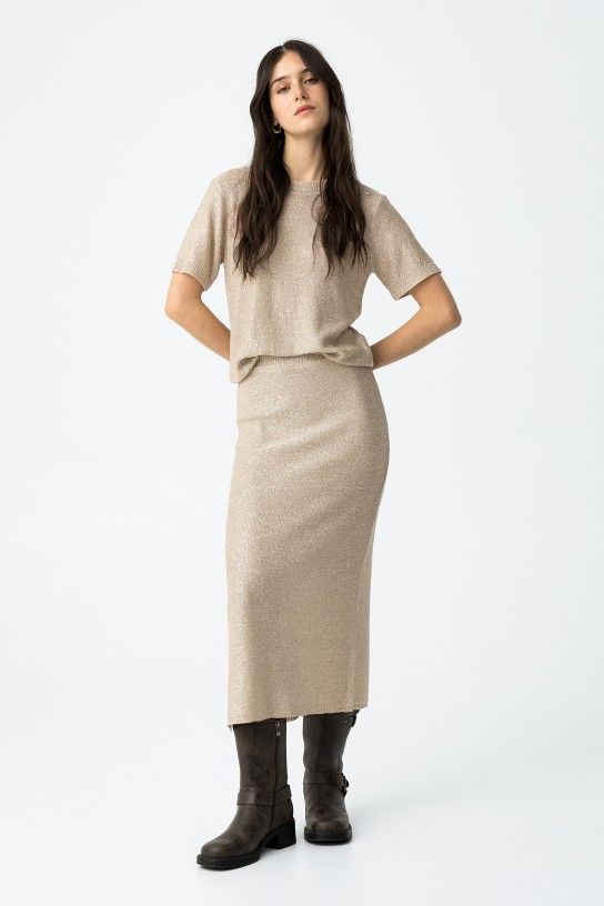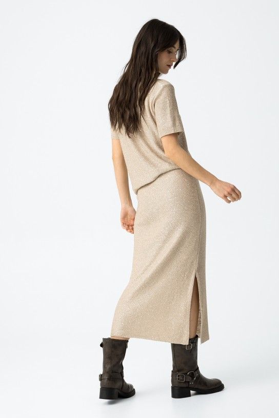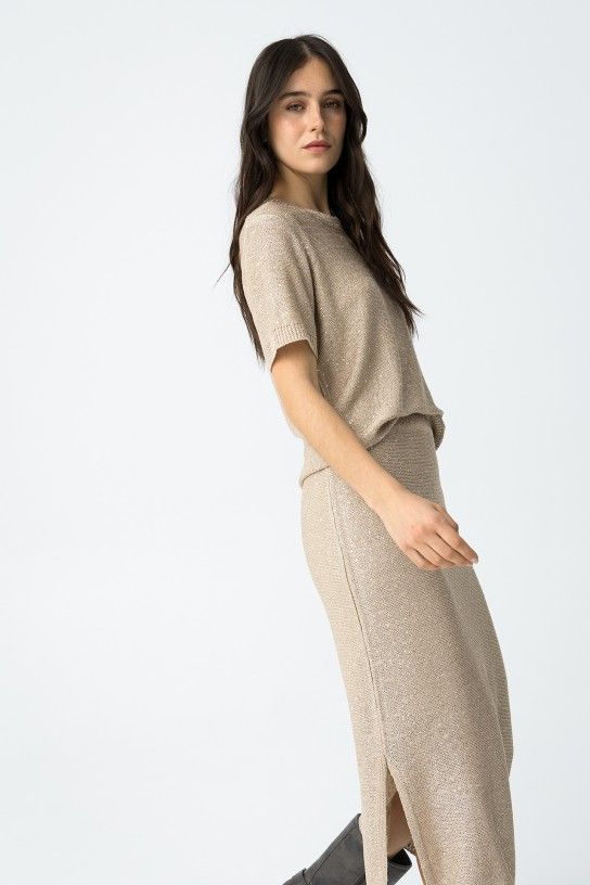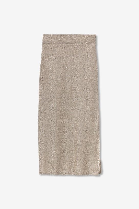 Elegante gonna in maglia con pailettes e spacco laterale, perfetta per ogni occasione. L'elastico in vita garantisce una vestibilità comoda e il design con micro pailettes la rende unica ed elegante. Aggiungi un tocco di luce e stile al tuo look con questa gonna versatile