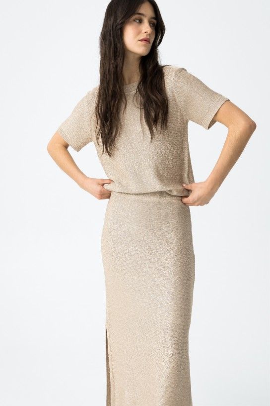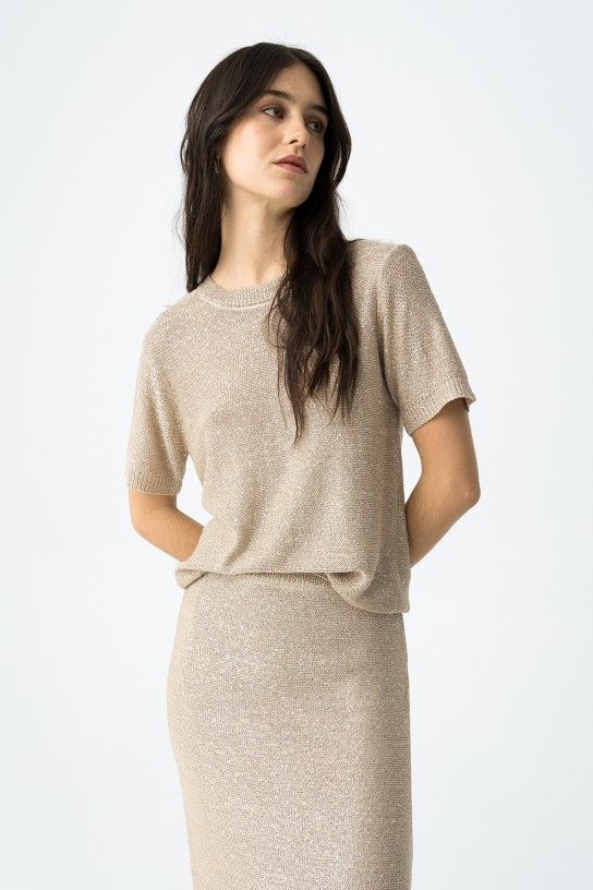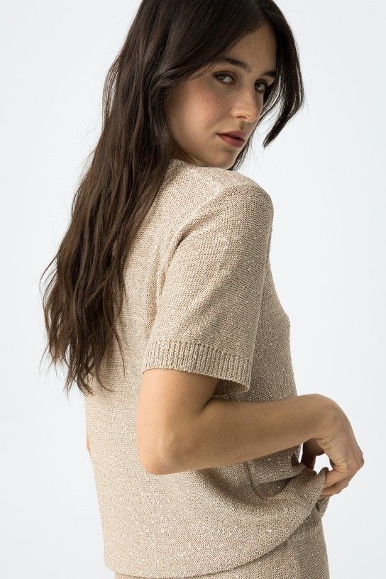 MAGLIA GIROCOLLO IN LUREX Questa maglia a mezza manica è perfetta per un look elegante e glamour. Le applicazioni di micro pailettes aggiungono un tocco di luce e la morbida maglia la rende comoda e versatile. La scelta perfetta per chi ama distinguersi con stile e originalità!