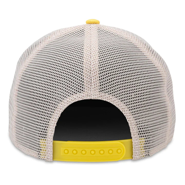 Corona strutturata a cinque pannelli in twill di cotone lavato con pannelli centrali e posteriori in mesh. Visiera precurvata e snapback in plastica. Strisce e logo sul pannello frontale serigrafati in opaco.