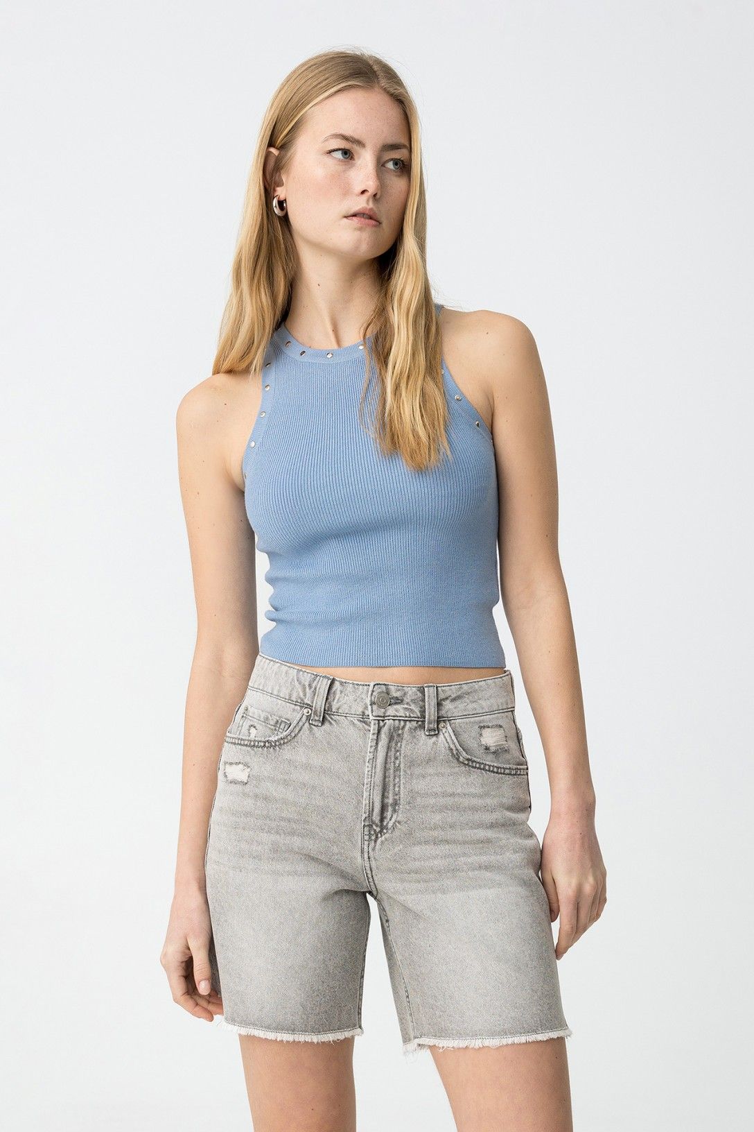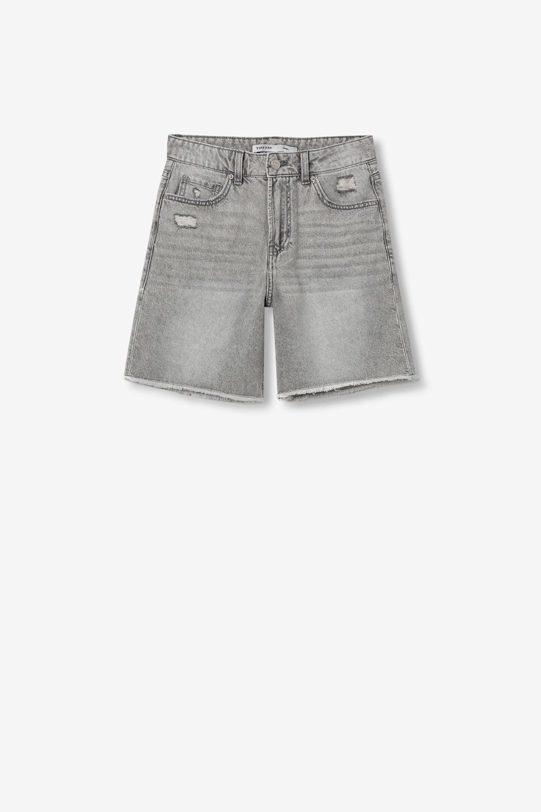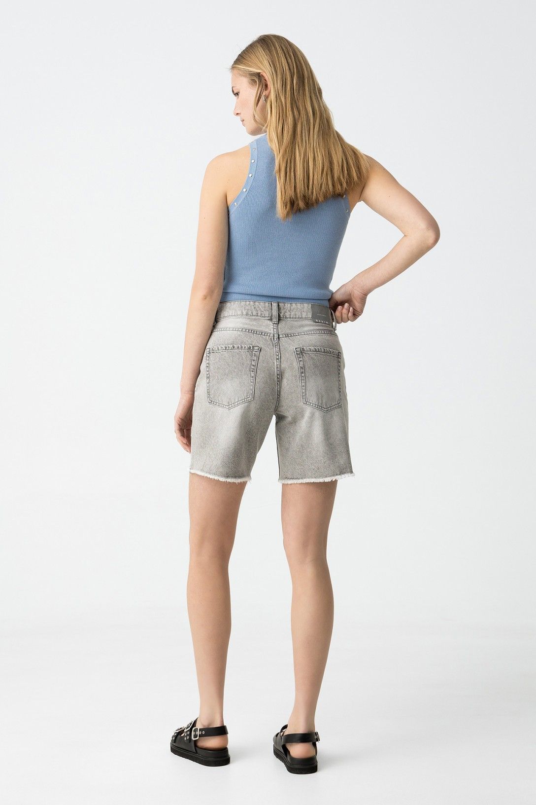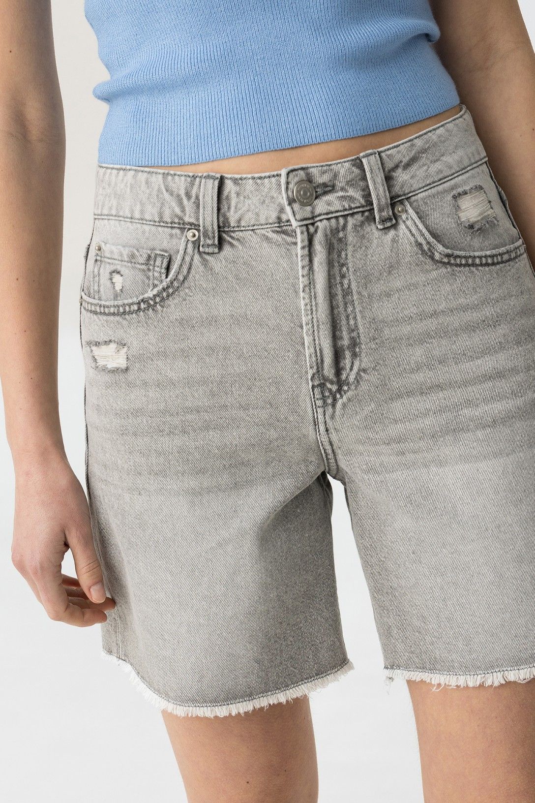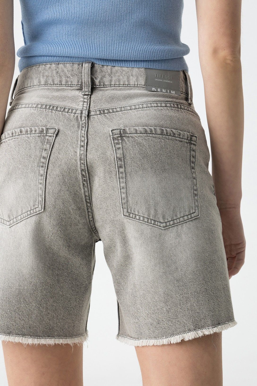 Shorts in denim con cinque tasche. Chiusura con zip e bottone metallico sul davanti.