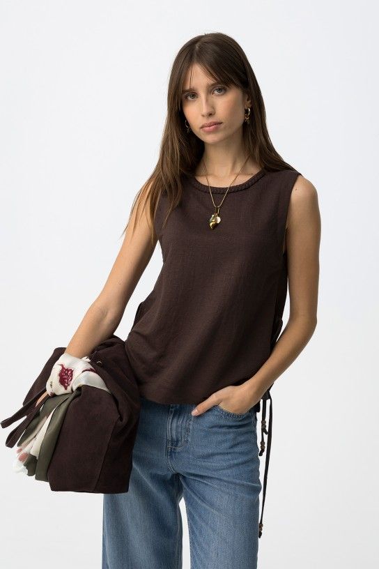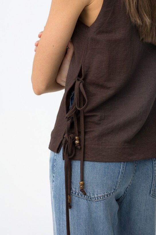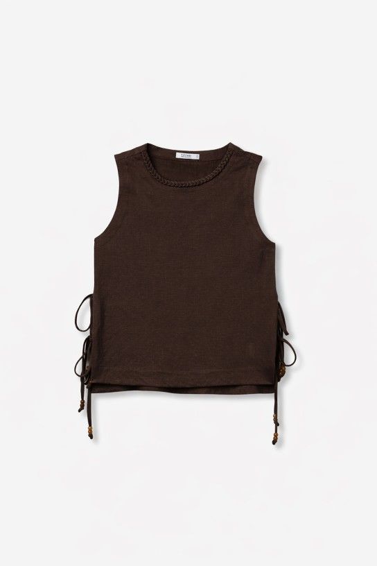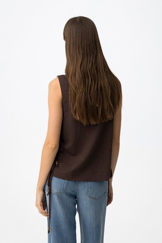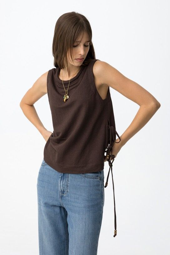Top senza maniche color marrone cioccolato, taglio dritto, con laccetti laterali e perline decorative, dallo stile casual.