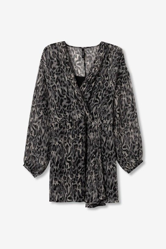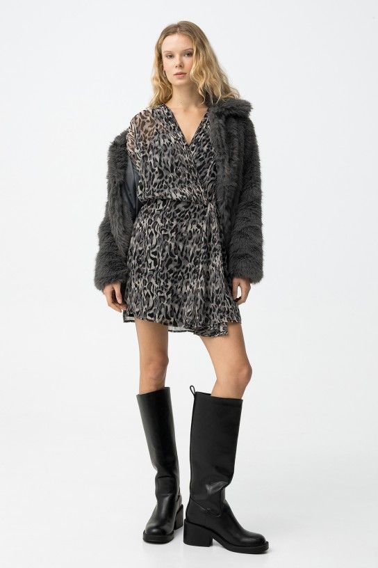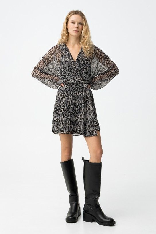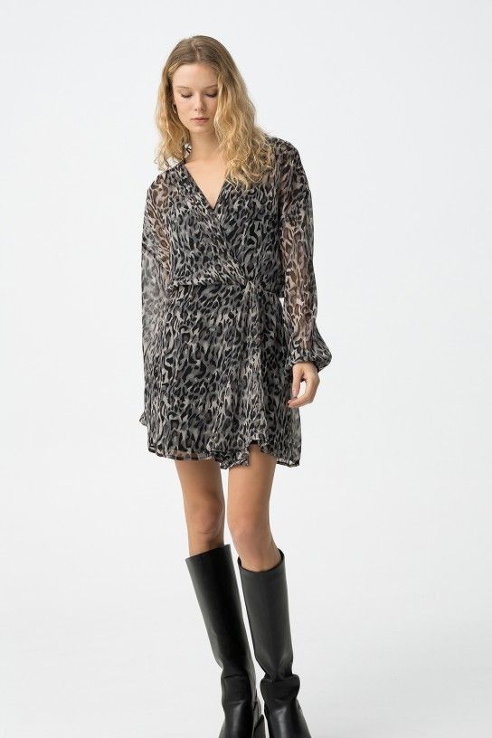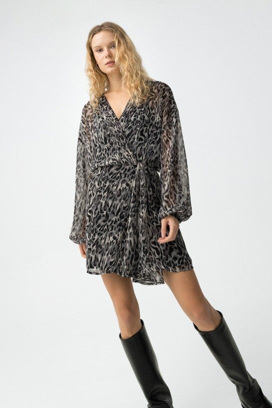 Il Dubai_1 di TIFFOSI è un abito fluido che cattura l'essenza del movimento consapevole. La stampa animalier aggiunge carattere a una tonalità grigio mélange che non scende a compromessi con la sofisticazione. Le maniche lunghe e lo scollo a V creano una silhouette che comunica eleganza senza sforzo apparente. Perfetto per chi sa che il vero stile risiede nella capacità di indossare dettagli audaci con naturalezza, questo abito è il pezzo che trasforma il quotidiano in una dichiarazione di personalità consapevole e raffinata.