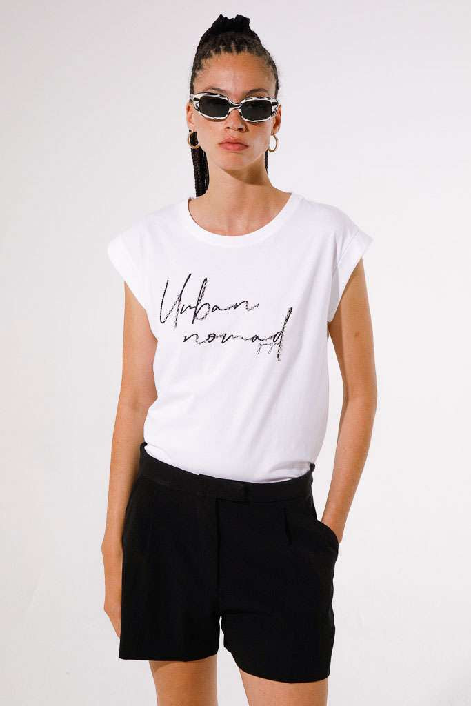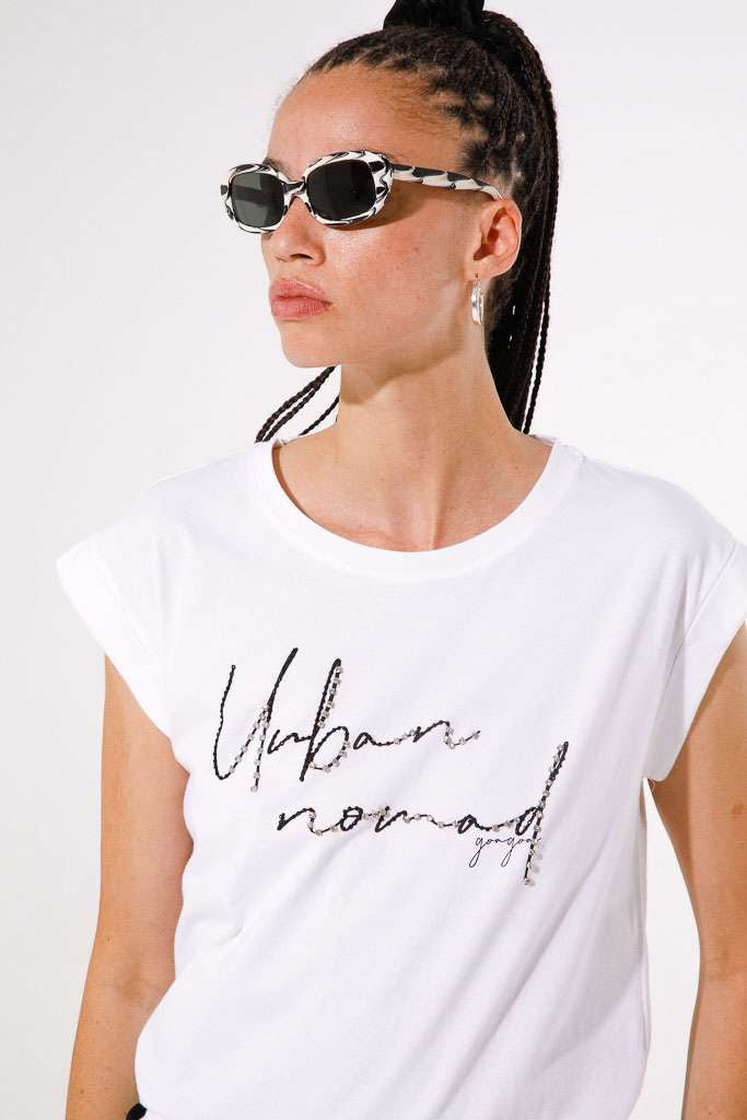 T-shirt in cotone con stampa “Urban Nomad” sul davanti