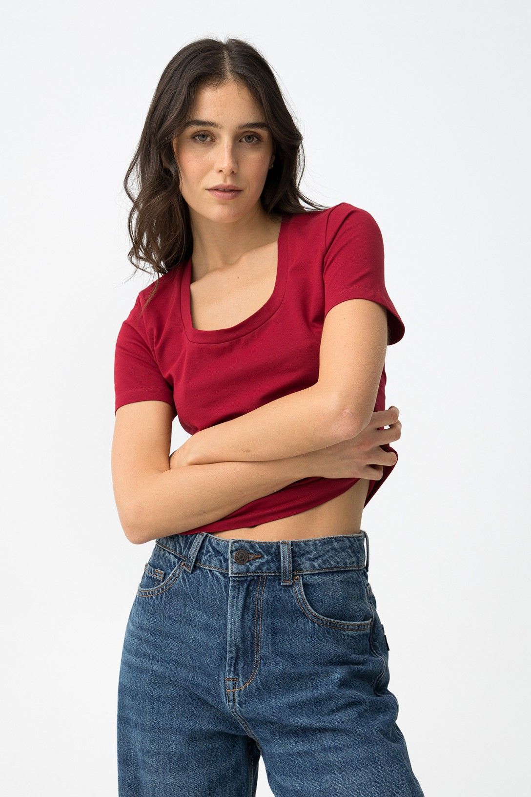 T-shirt in tinta unita che gioca con uno scollo a U che valorizza la silhouette con eleganza discreta. Semplice ma sofisticata, è il capo che si adatta a mille occasioni diverse senza complicazioni. Un pezzo versatile che trasforma il quotidiano in uno stile consapevole e raffinato.