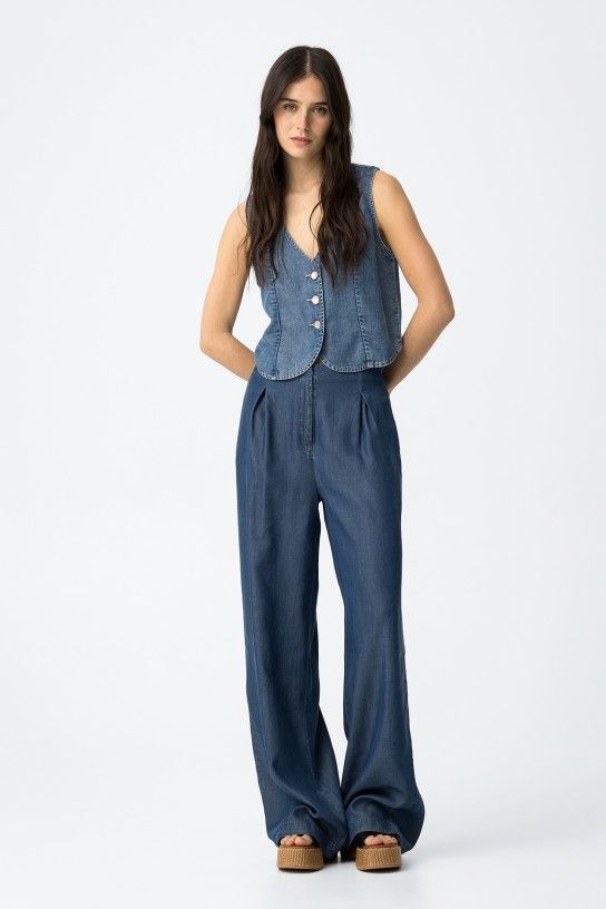 Esalta la tua femminilità con il pantalone chambray a palazzo con pieghe! Taglio fluido e un tessuto leggero, questo pantalone è perfetto per le giornate d'estate. Le pieghe aggiungono un tocco elegante, mentre il tessuto traspirante ti mantiene fresca e comoda per tutto il giorno. Sii sicura di te e affronta la giornata con stile!