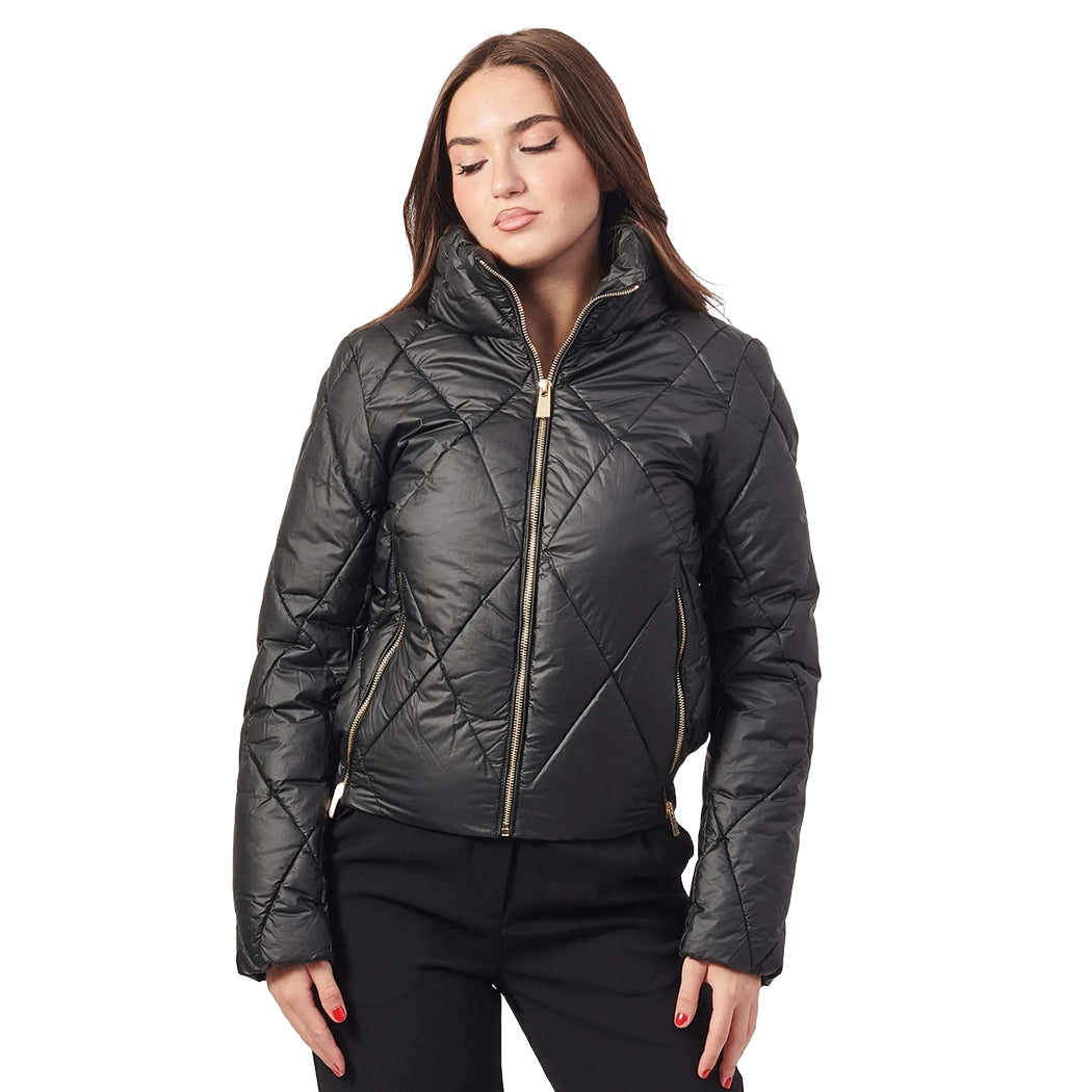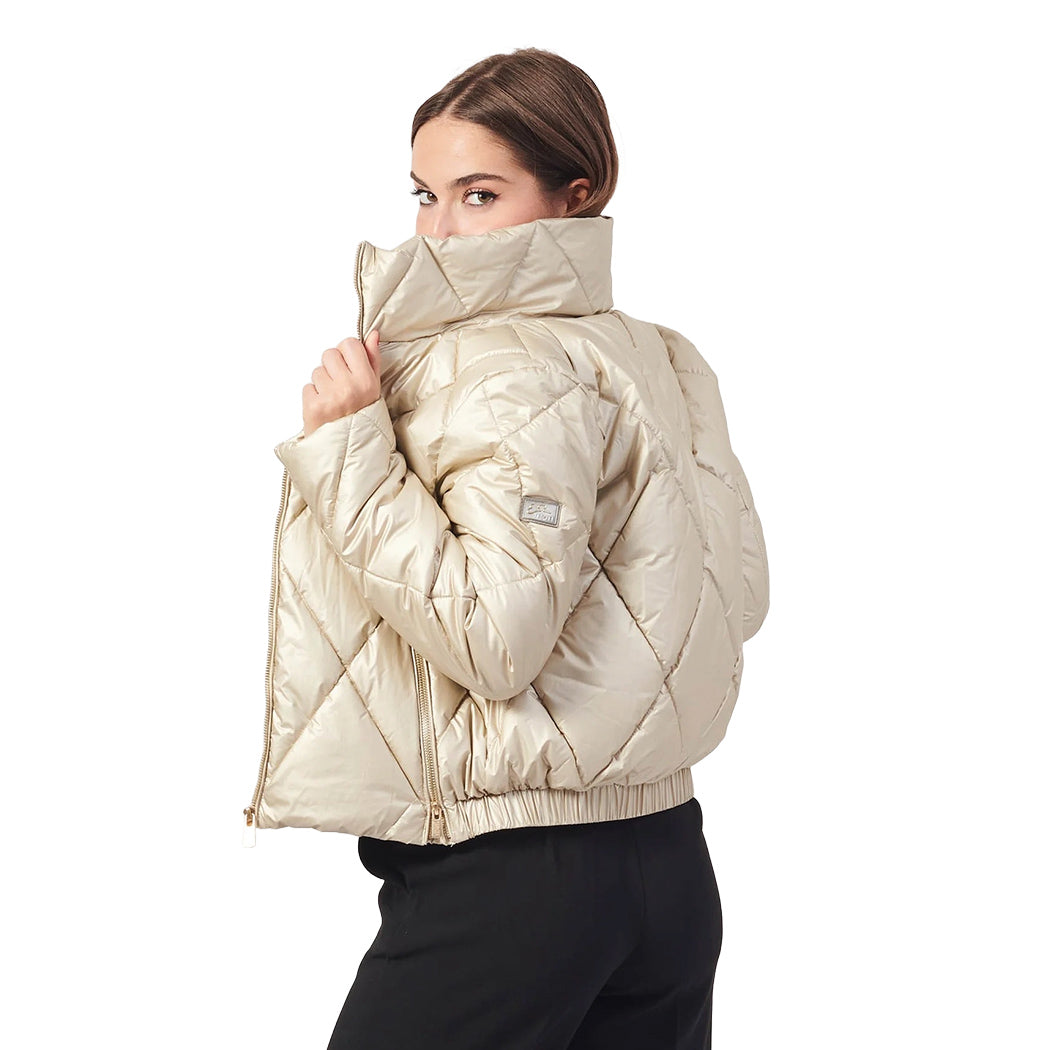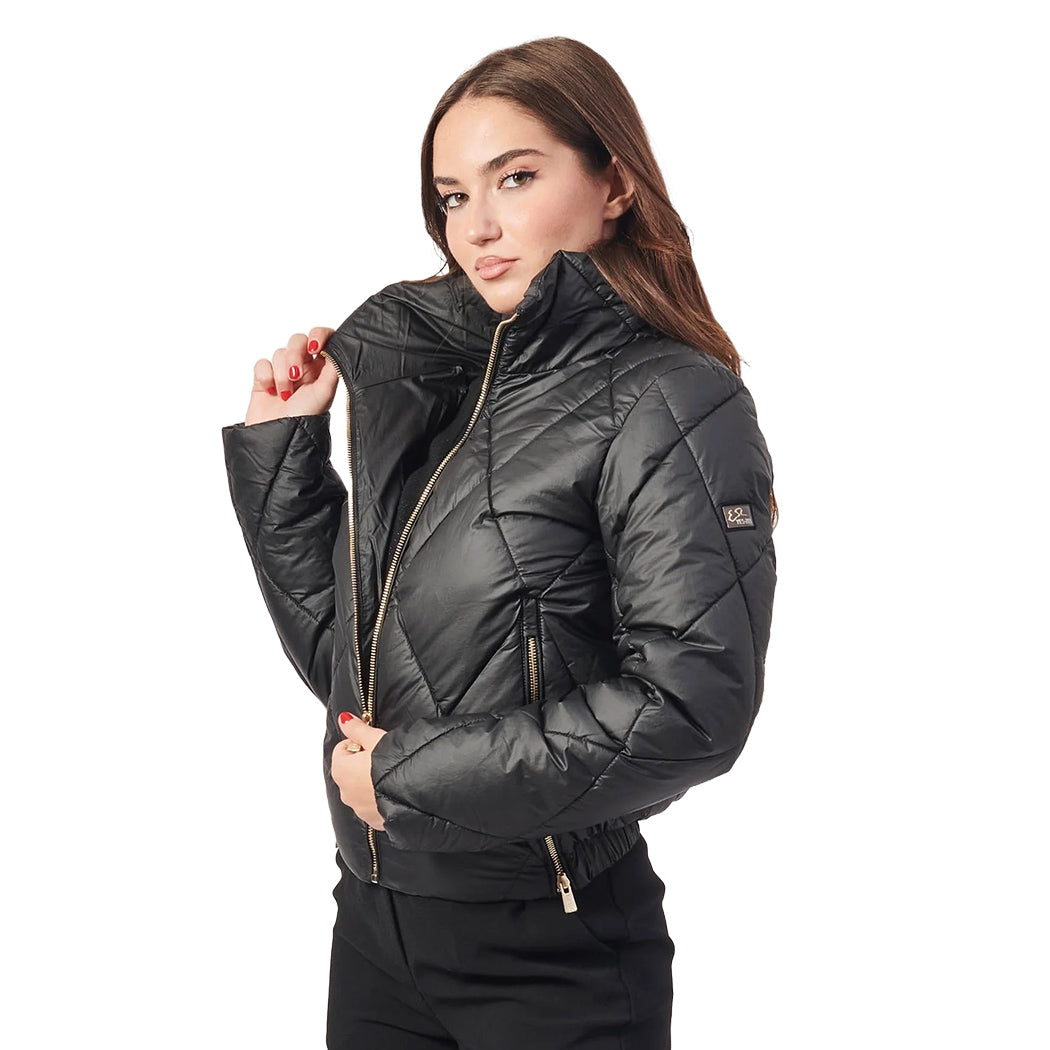 Piumino Yes Zee da donna in tessuto trapuntato a rombi di nylon a finitura metallizzata, corto, a collo alto avvolgente, con imbottitura sintetica, chiusura centrale full zip, soffietti e tasche laterali a filo con zip, tag logo gommato applicato sulla manica lunga e fondo posteriore elastico.