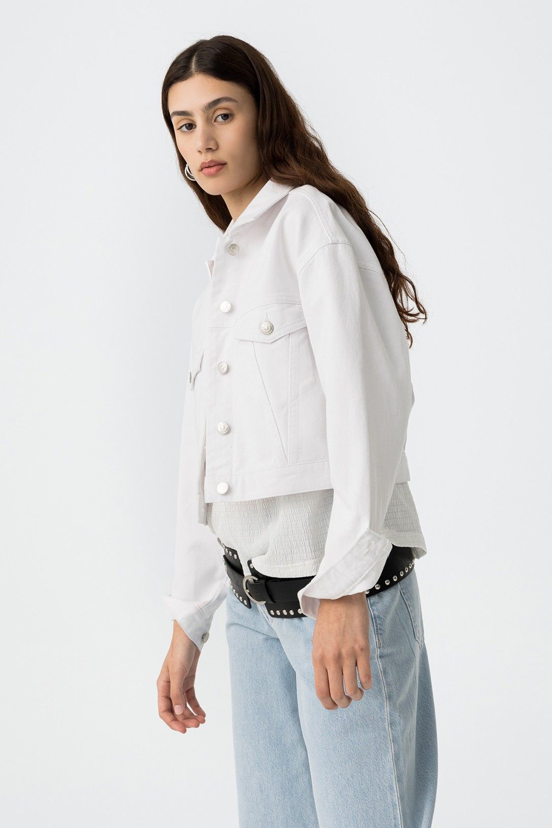 Giacca in denim con collo a patta, tasche applicate e chiusura con bottoni metallici.