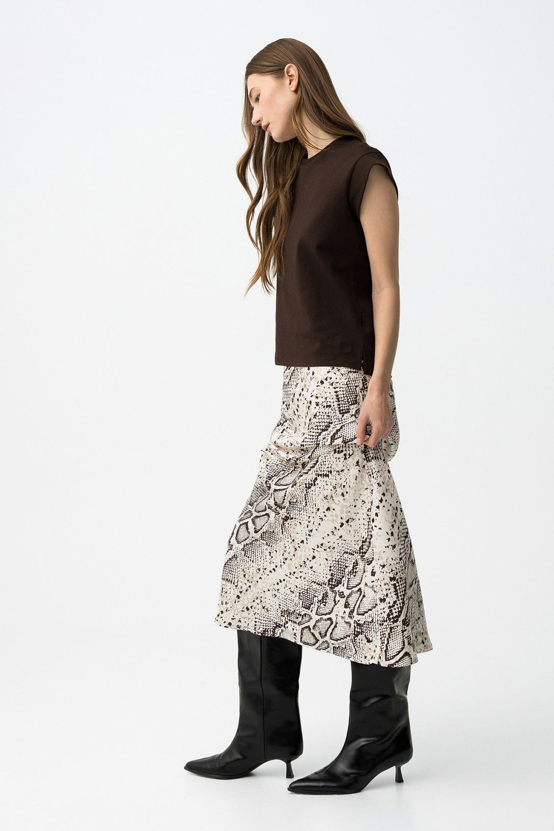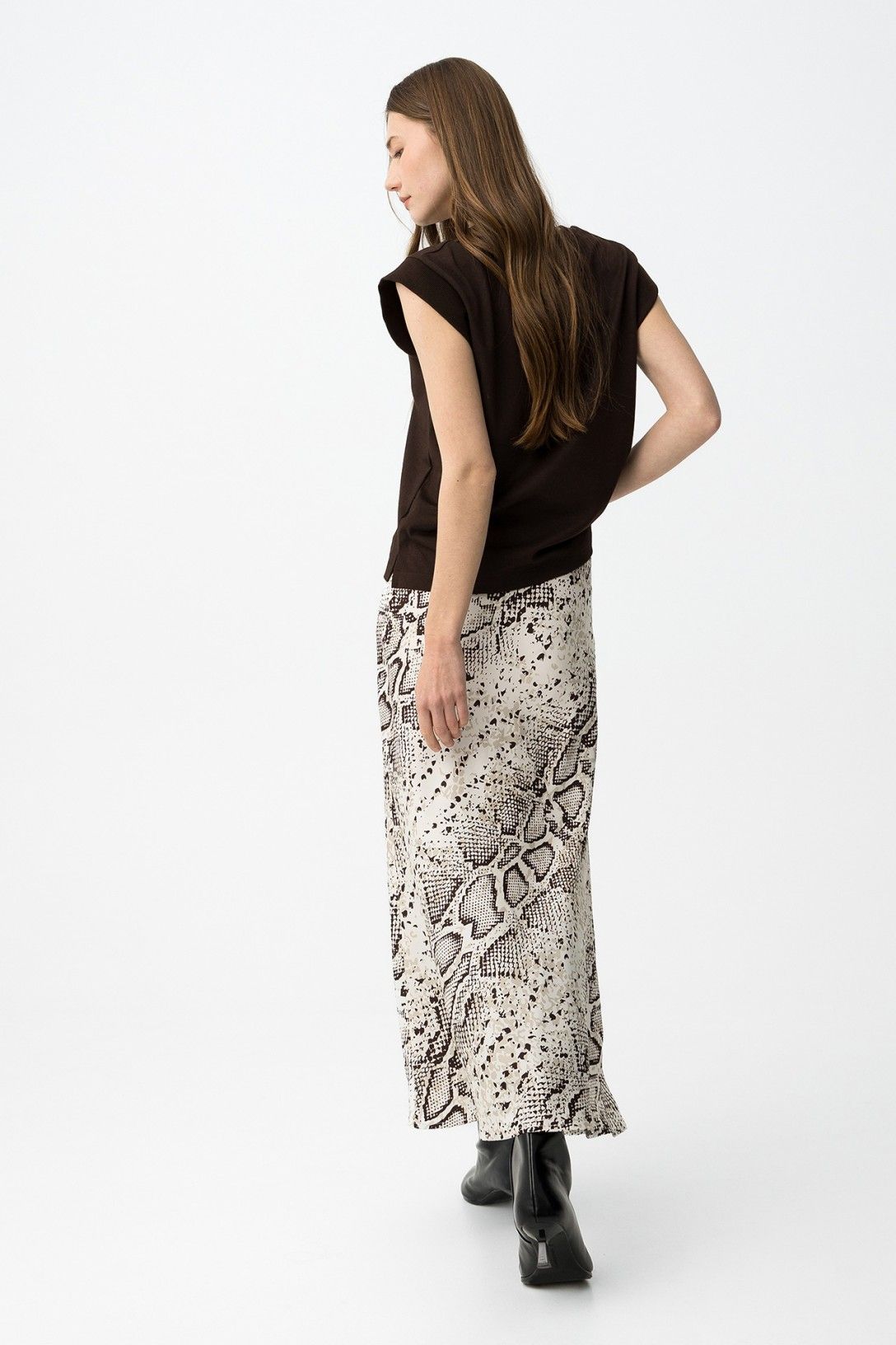 Gonna lunga in raso con affascinante stampa pitonata che aggiunge un tocco selvaggio e sofisticato al tuo guardaroba. Il tessuto morbido e lucido scivola elegantemente, mentre il motivo animalier la rende il pezzo perfetto per chi ama osare con stile. Indossala per serate speciali e lascia che tutti notino il tuo gusto impeccabile.