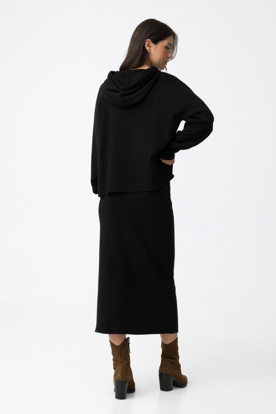Gonna midi in maglia elasticizzata con vita alta e pratico spacco laterale. Il design essenziale e versatile la rende perfetta per creare look sofisticati sia in contesti casual che più formali. La maglia di qualità garantisce comfort durante tutto il giorno,
