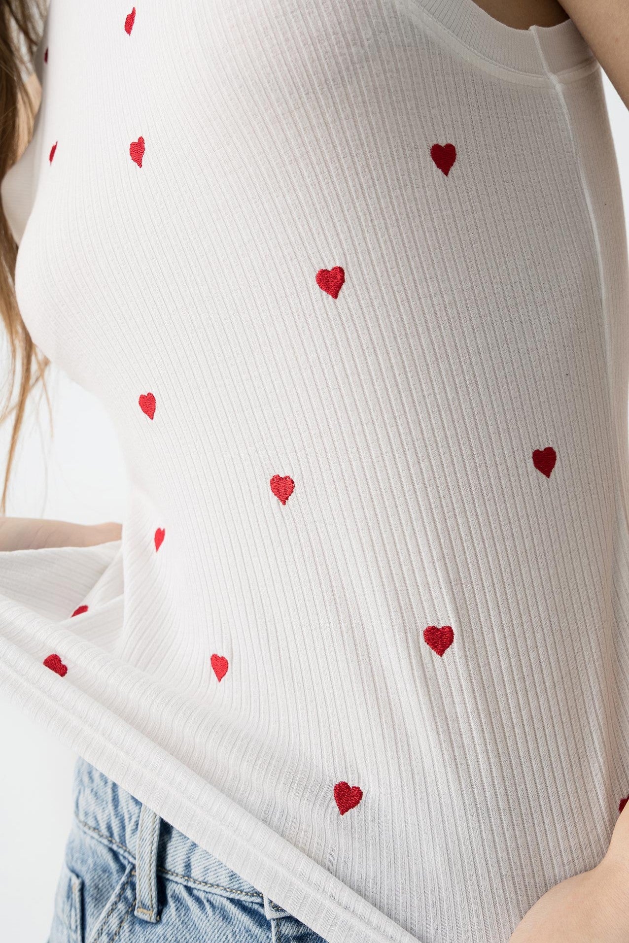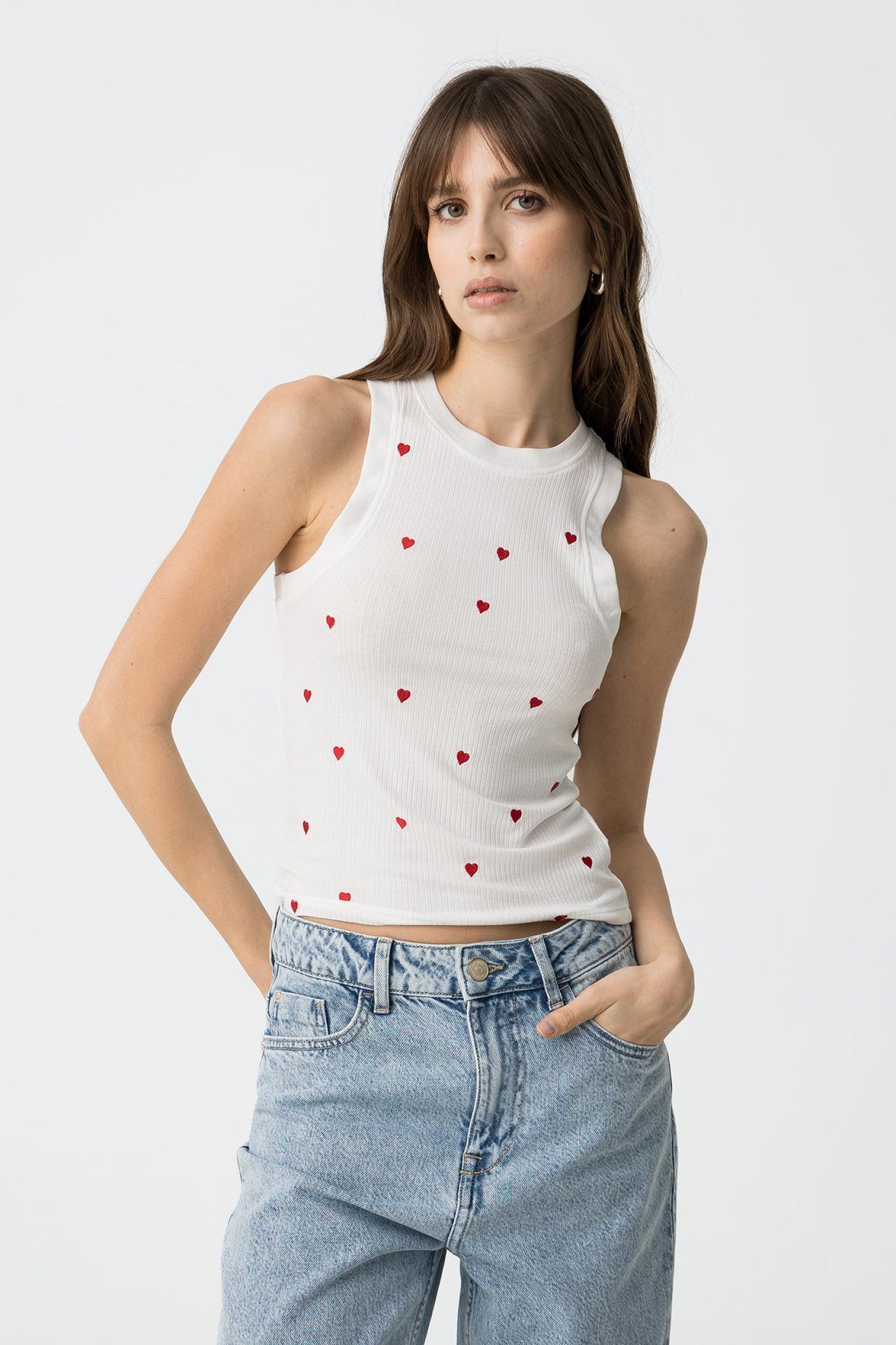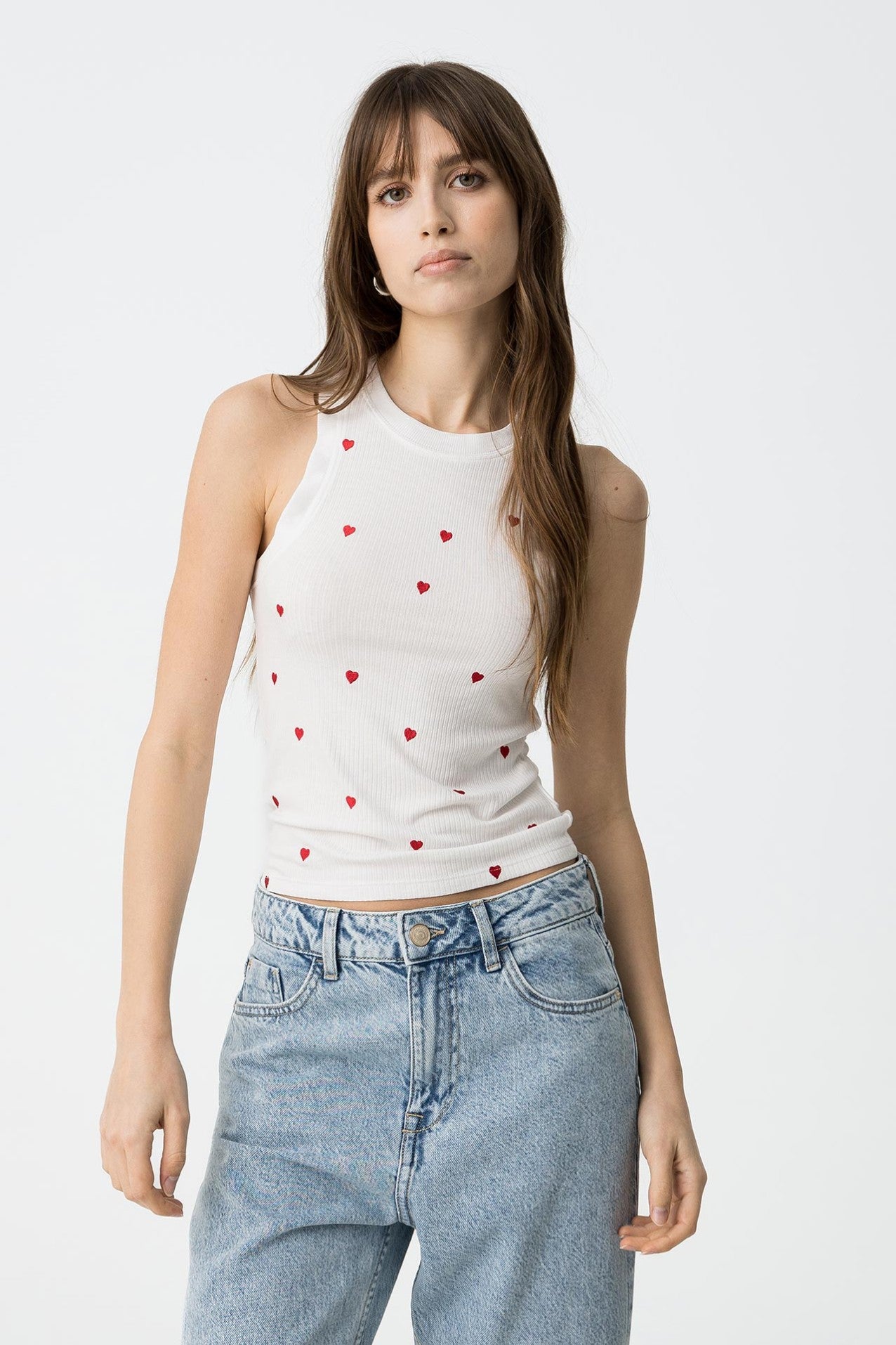 Il top LOBBY presenta un design elegante con scollo rotondo e maniche a giromanica. Il ricamo a cuore sul davanti lo rende unico e femminile. Aggiungi un tocco di dolcezza e stile al tuo look con questo versatile capo.