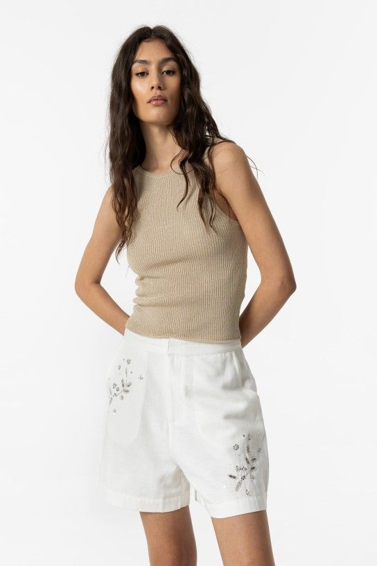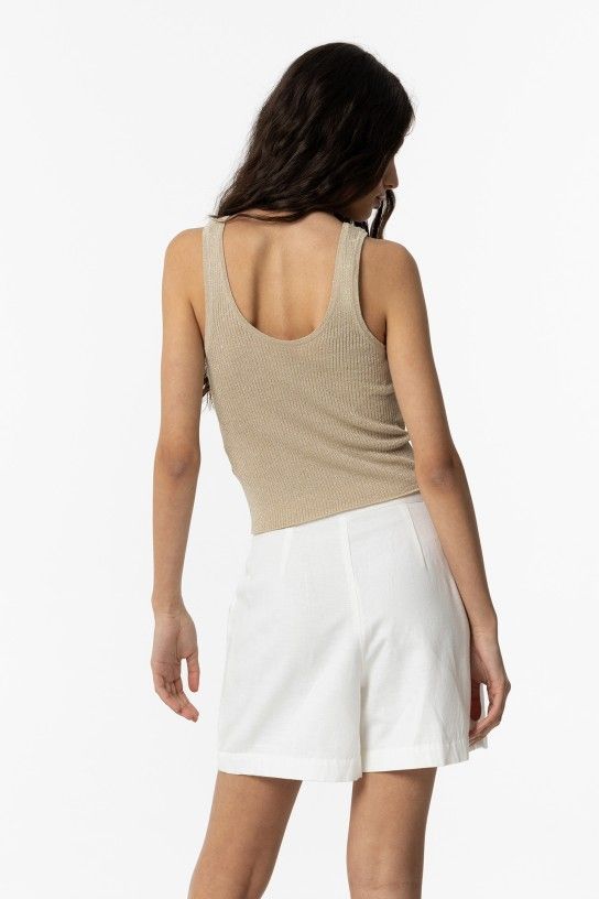 Elegante top in lurex con trama costina che cattura la luce con ogni movimento. Il tessuto brillante e sofisticato crea un effetto luminoso perfetto per occasioni speciali e serate glamour. Vestibilità moderna e confortevole, ideale da abbinare a pantaloni eleganti o gonne per un look raffinato e affascinante.