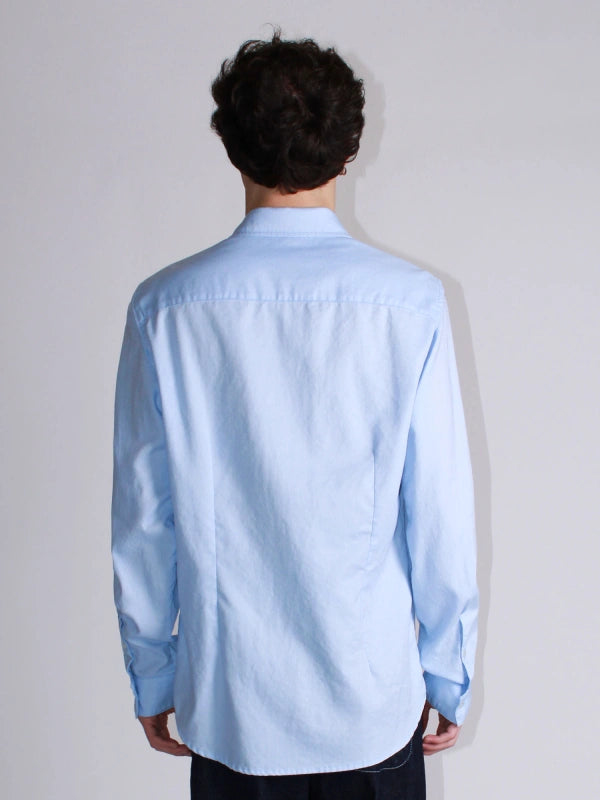 Camicia in puro cotone. Colletto classico. Chiusura centrale con bottoni nascosti, maniche lunghe e polsino. Doppia pinces sul retro. Etichetta logo sul fondo. Fondo arrotondato