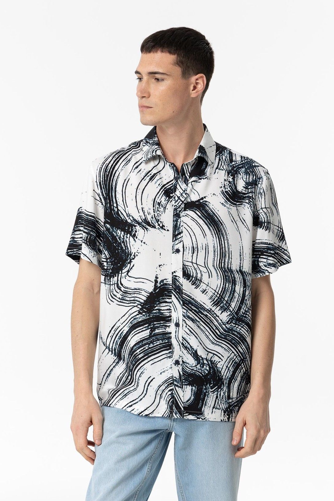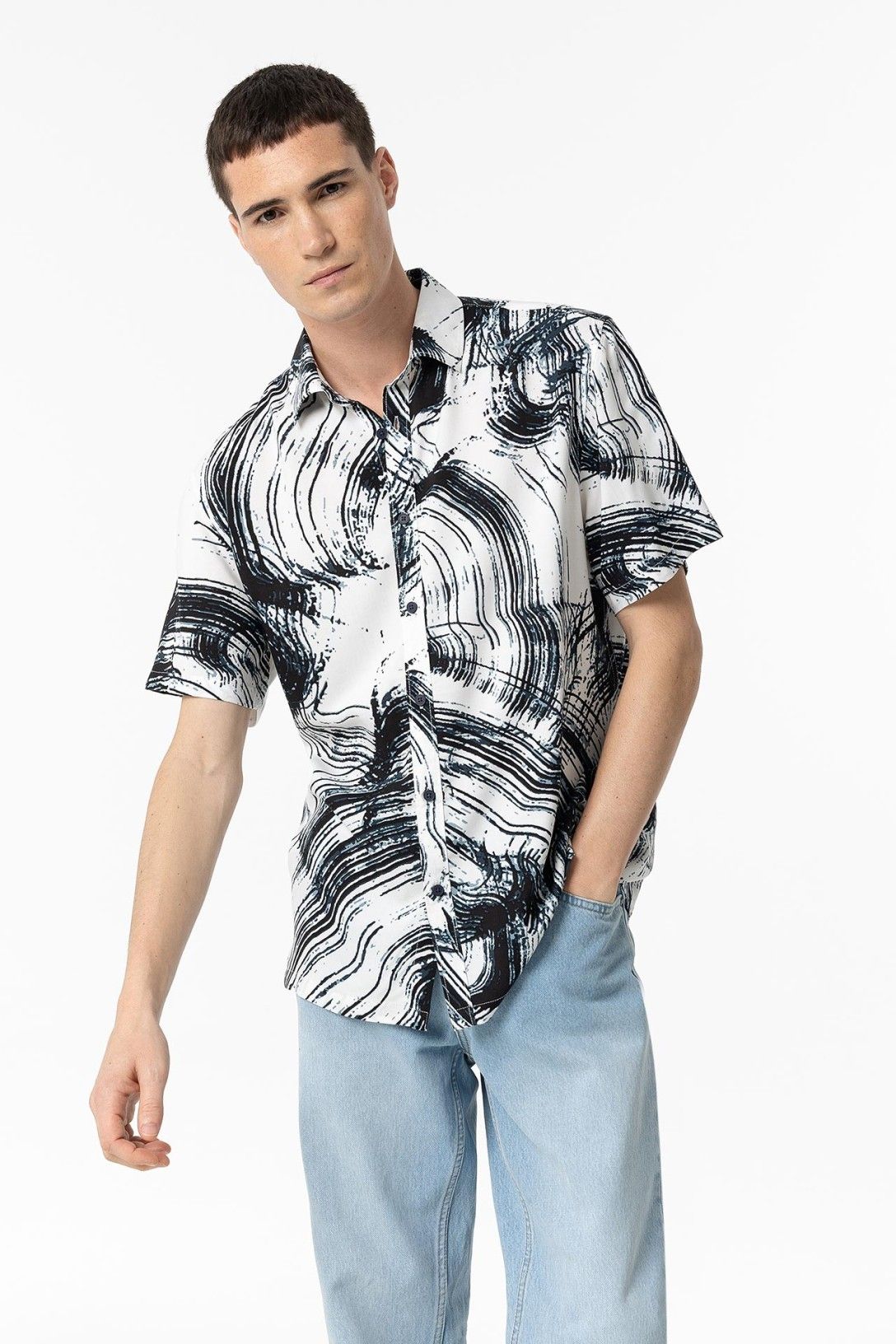 Camicia stampata con colletto a punta e maniche corte. Abbottonatura frontale.