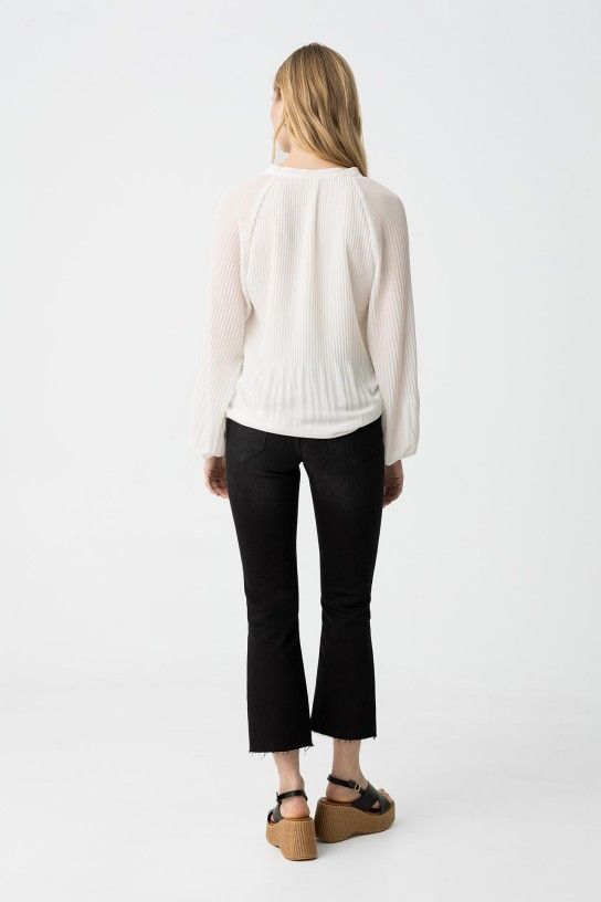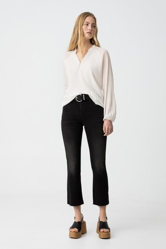 Jeans a vita alta con cinque tasche. Chiusura frontale con cerniera e bottone metallico. Orlo sfilacciato