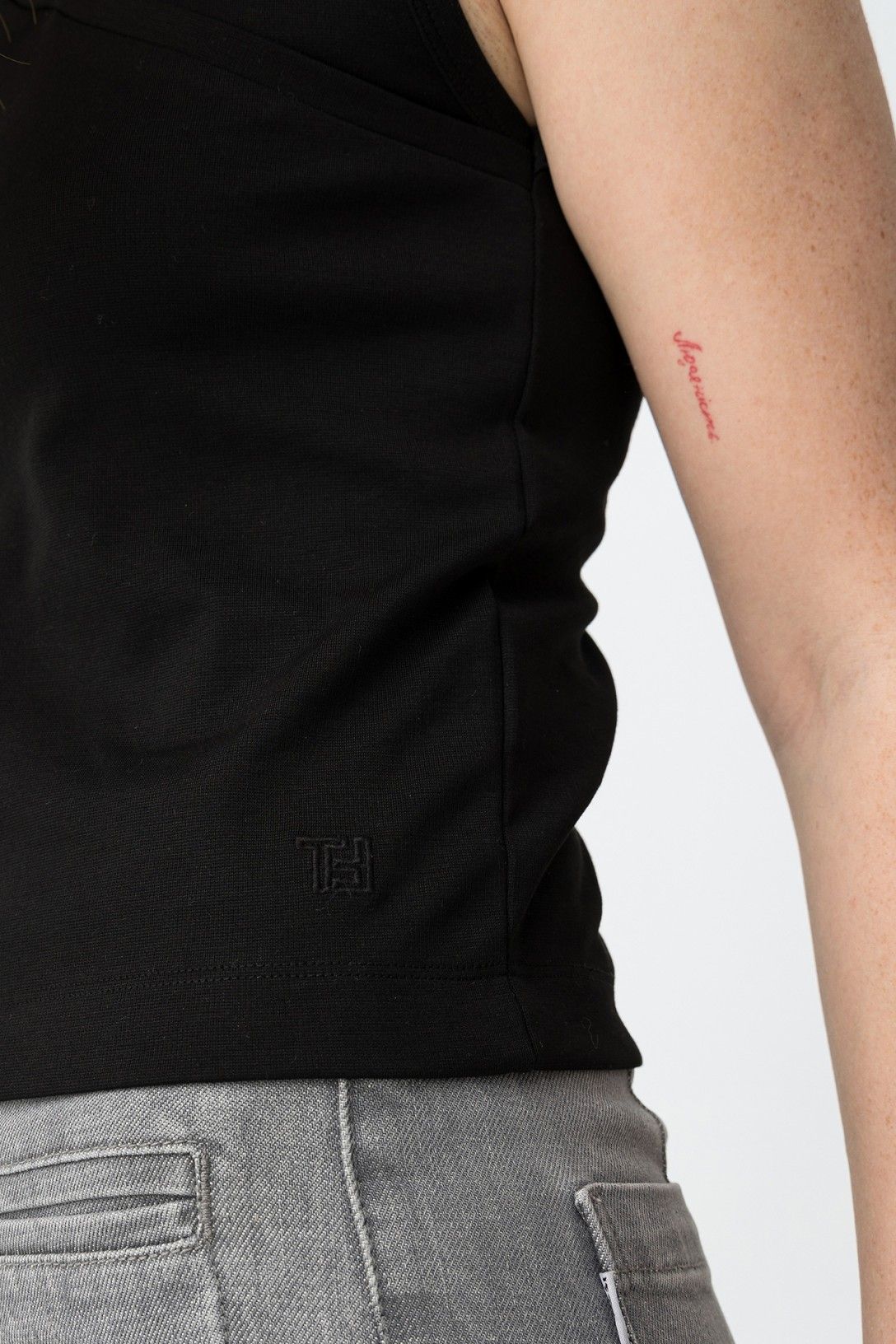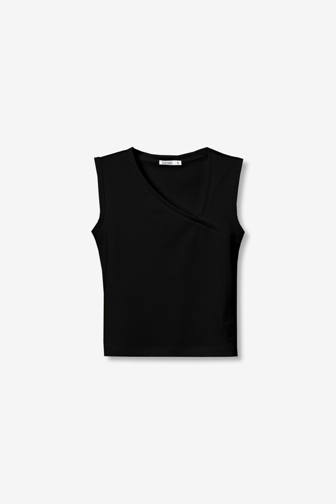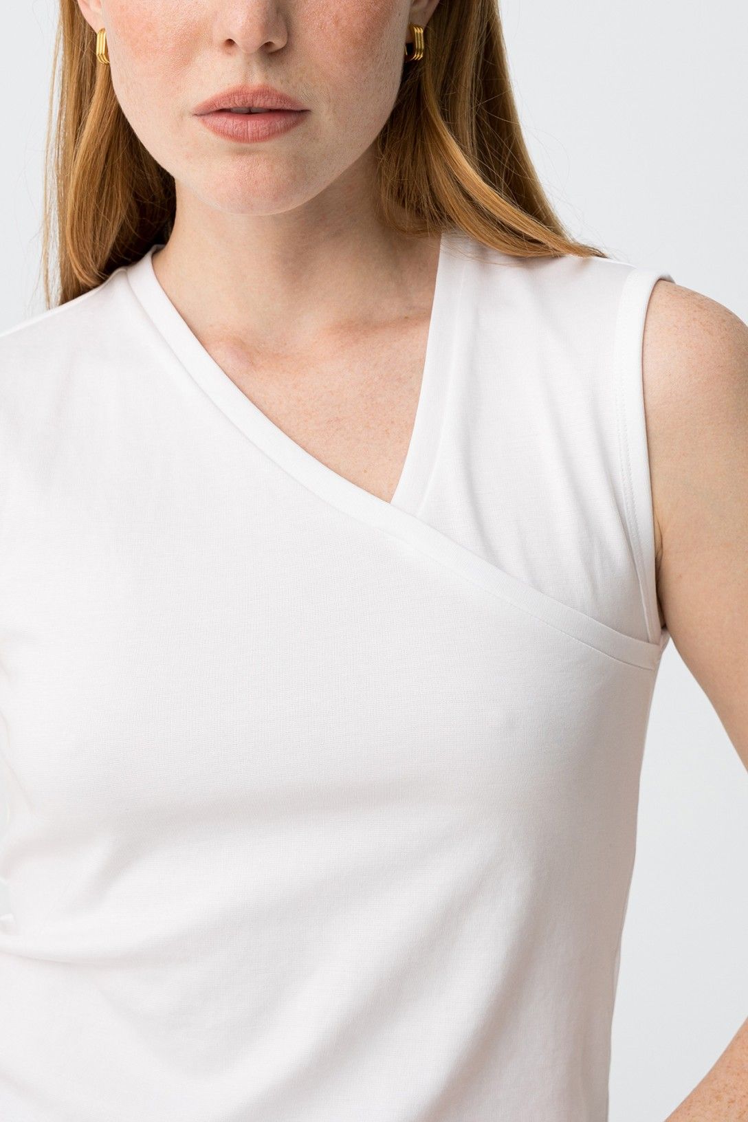 Top vestibilità attillata, senza maniche, scollo a V, con finitura minimalista e moderna.