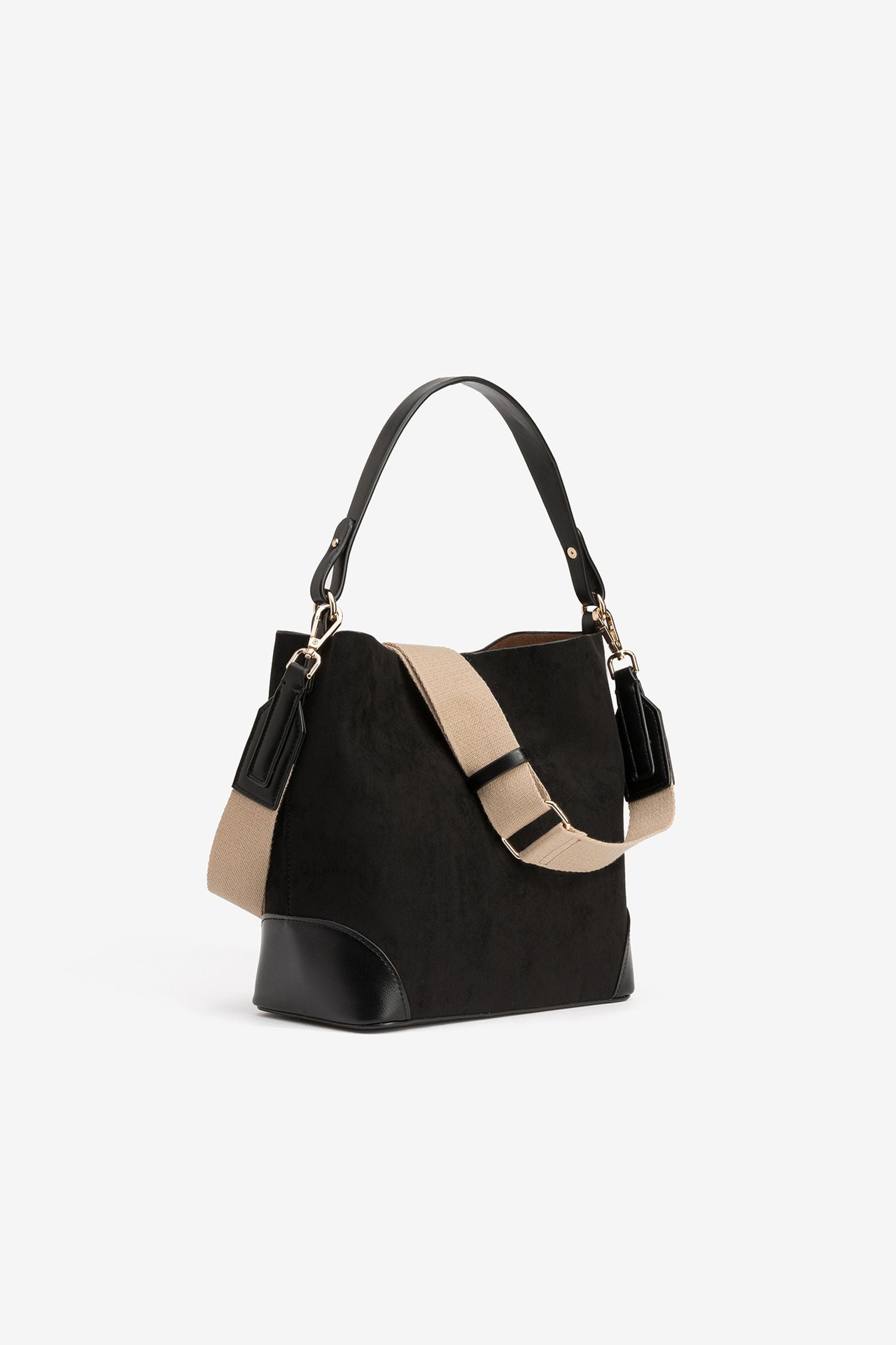 Borsa marrone con tracolla regolabile beige, dettagli in pelle scura e tasca interna rimovibile.