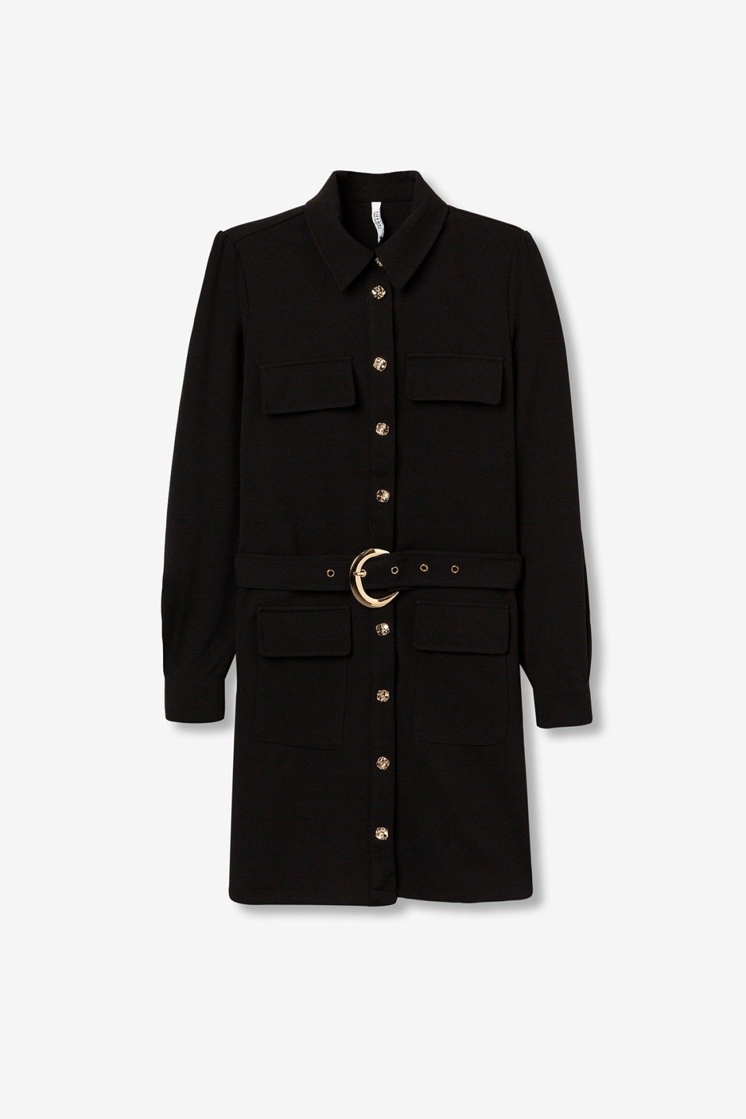 L’abito Silvy_1 si distingue per il colletto raffinato e i bottoni oro che aggiungono un tocco di lusso discreto. La cintura in vita sottolinea la silhouette, garantendo una vestibilità elegante e femminile. Perfetto per chi cerca un capo sofisticato e versatile, ideale per ogni occasione.