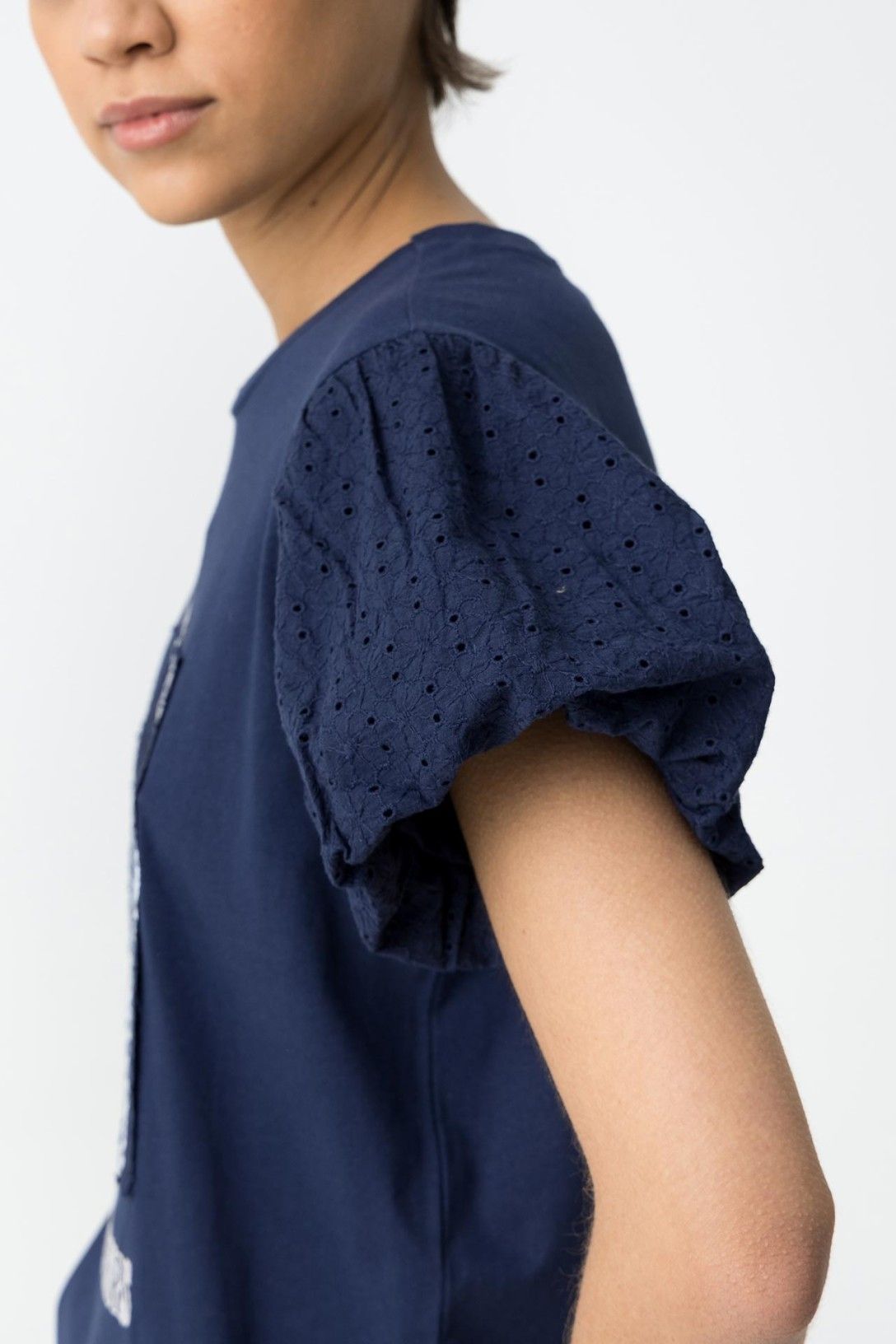 T-shirt girocollo a maniche corte con ricamo inglese. Ricamo e applicazione sul davanti.Maglietta con maniche ricamate