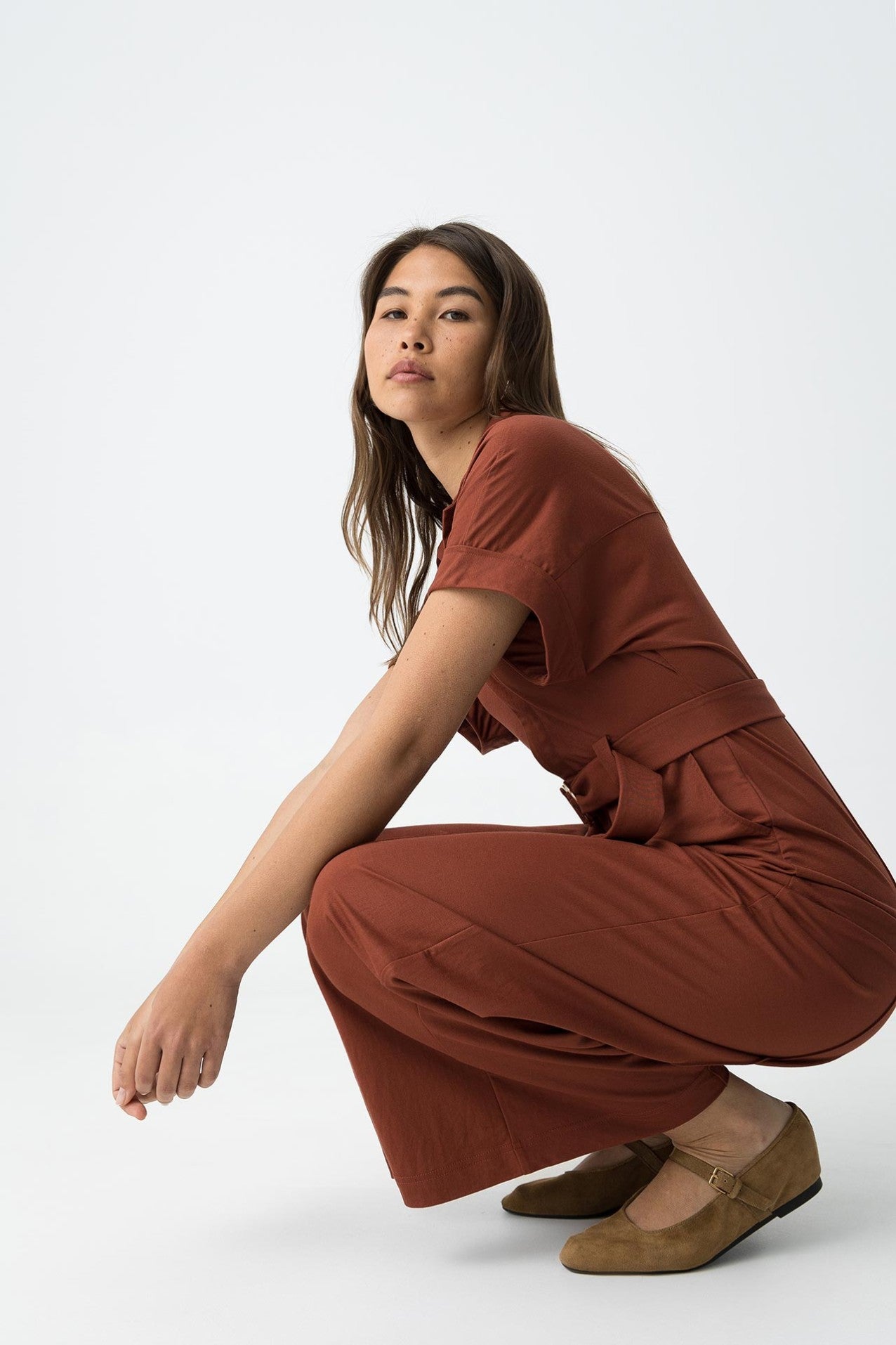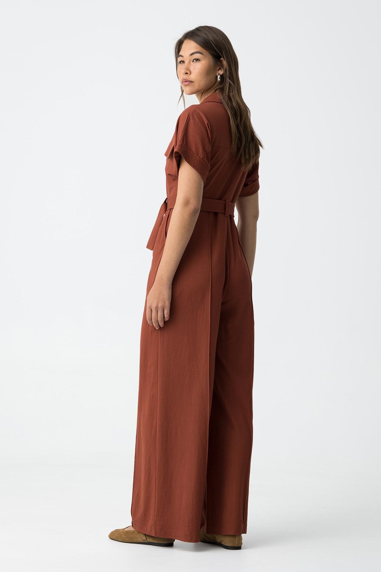 Tuta con revers a V e maniche corte. Applicazione di cintura dello stesso tessuto.