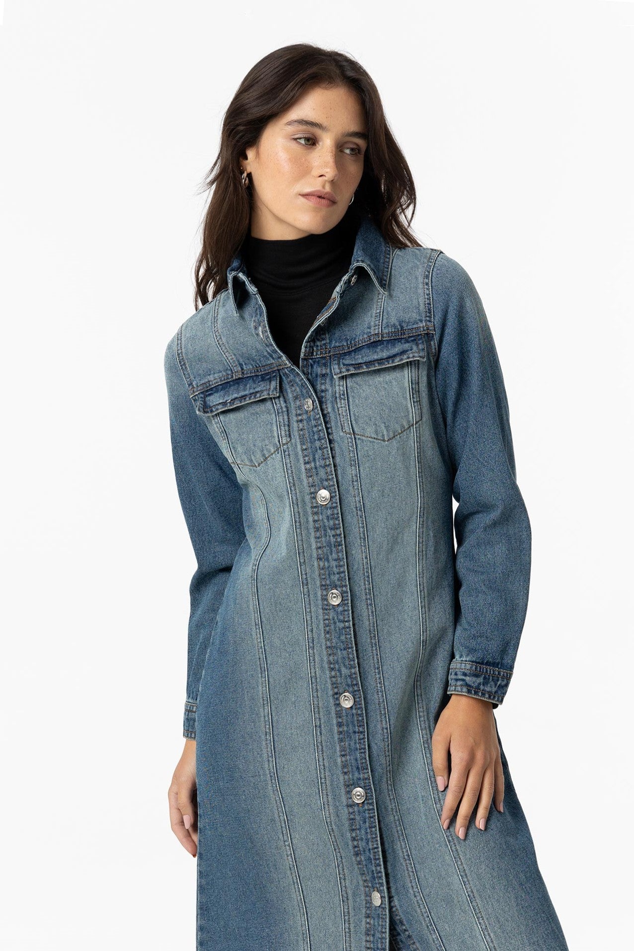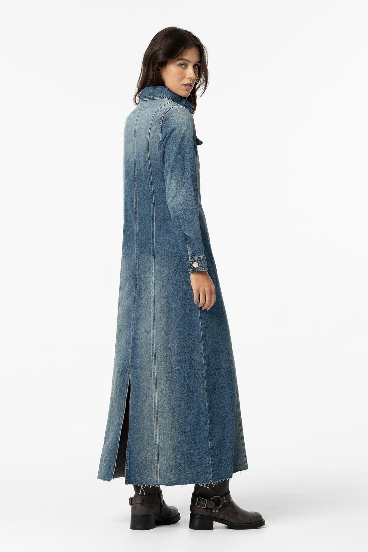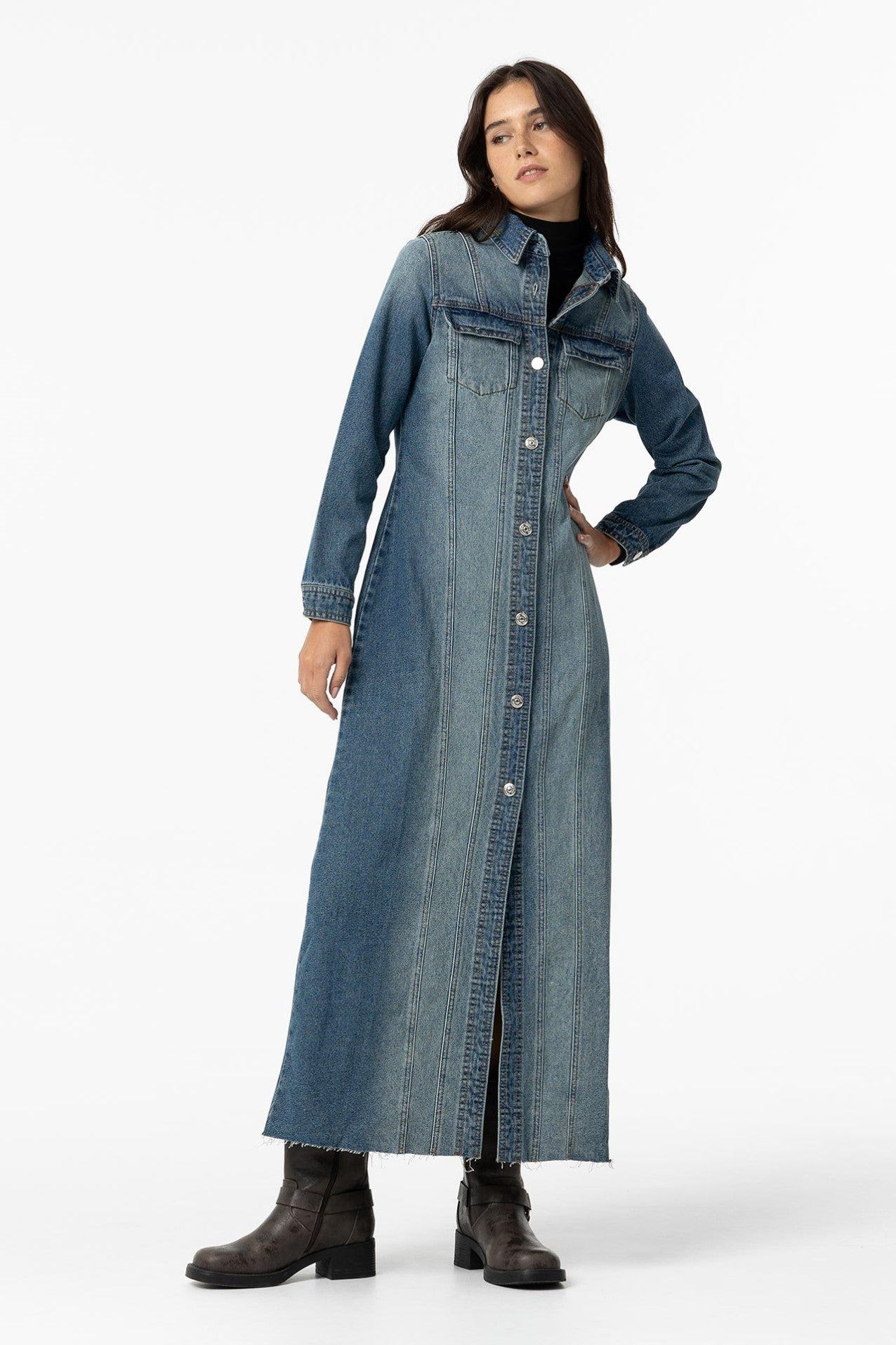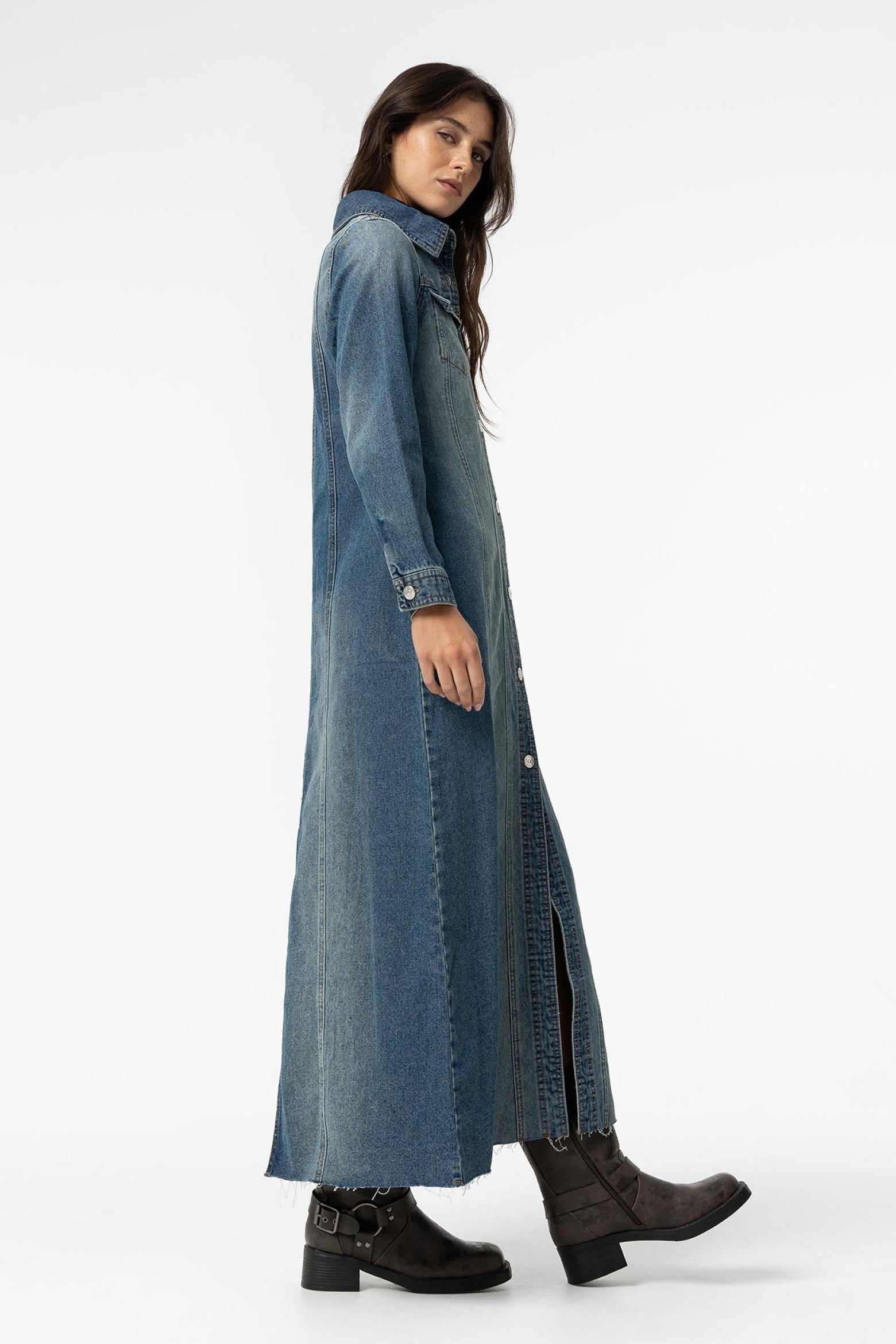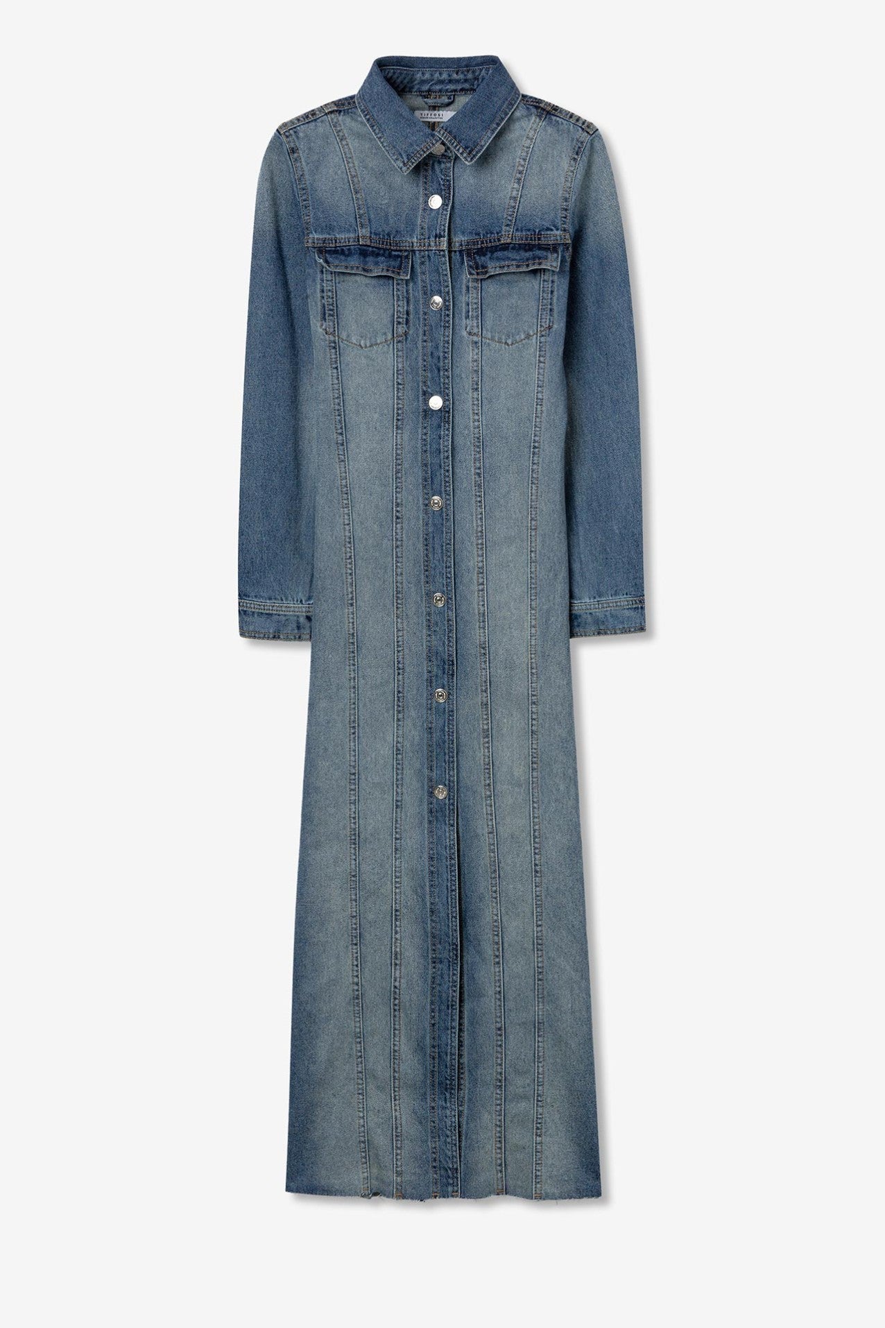 Questo abito lungo in denim Zelda è dotato di bottoni funzionali che facilitano l'indossamento e lo rendono flessibile per diverse occasioni. Realizzato in denim di alta qualità, offre resistenza e comfort, oltre a un design moderno e alla moda. Perfetto per un look casual ma elegante.